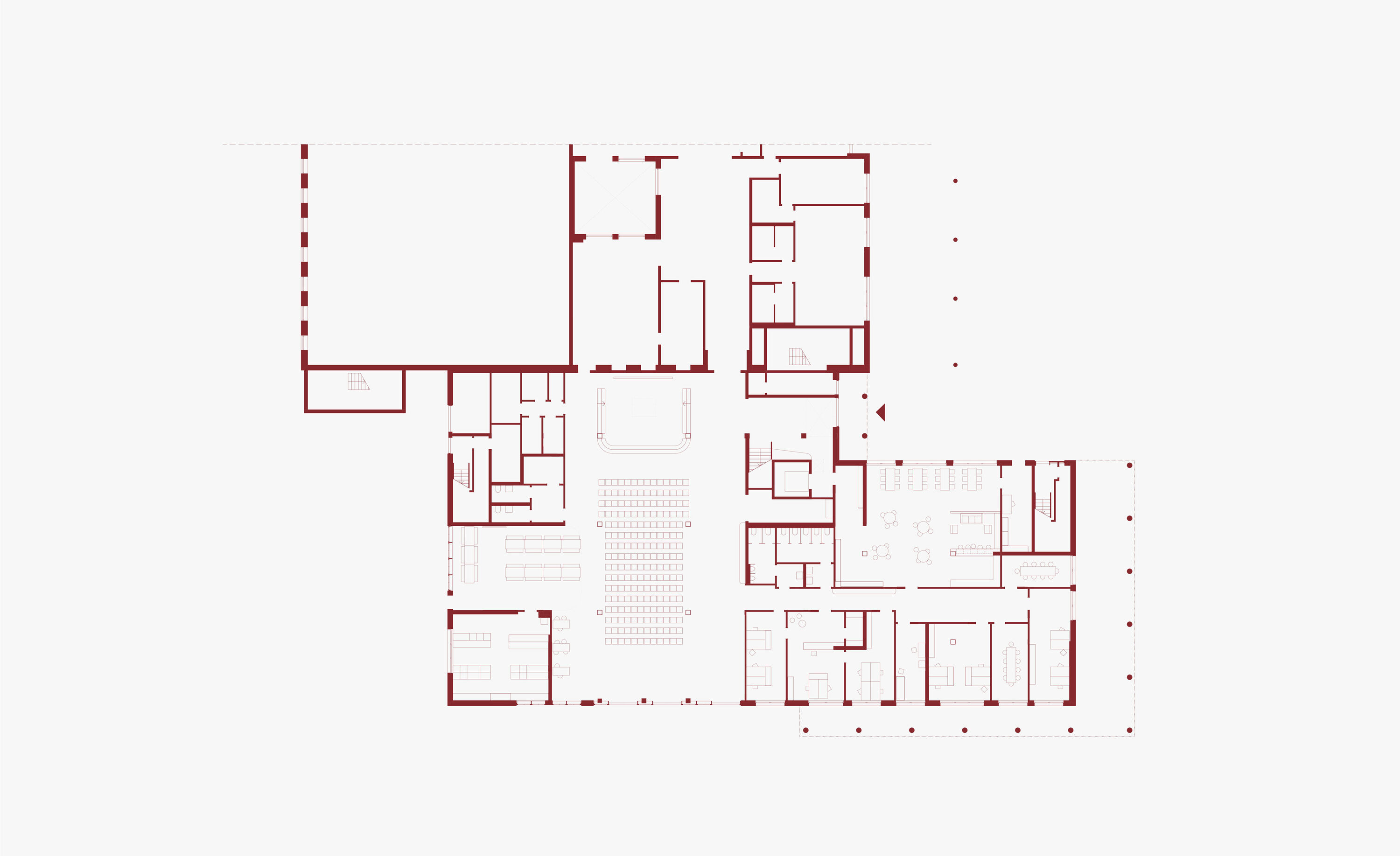 On the ground floor, users enter the open heart of the new building: the auditorium with a stage, dining area, and adjoining teaching kitchen becomes the communicative center of the school. Thanks to generous glazing, high amenity value, and flexible usage options, it serves as an event venue, learning space, and meeting place all at once. The administration, the teachers' room, and the secretariat are connected to the auditorium and are therefore easily accessible to everyone.
