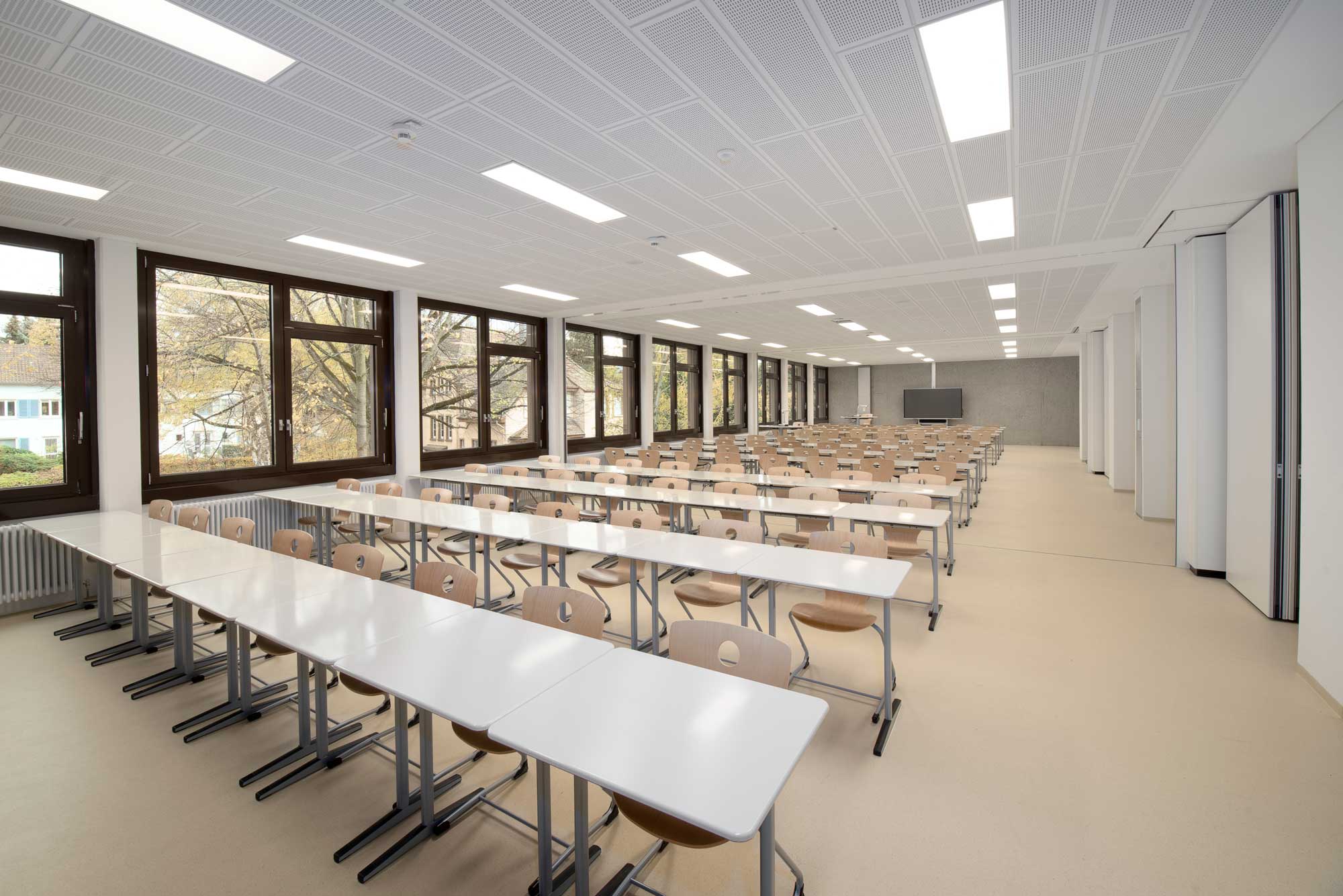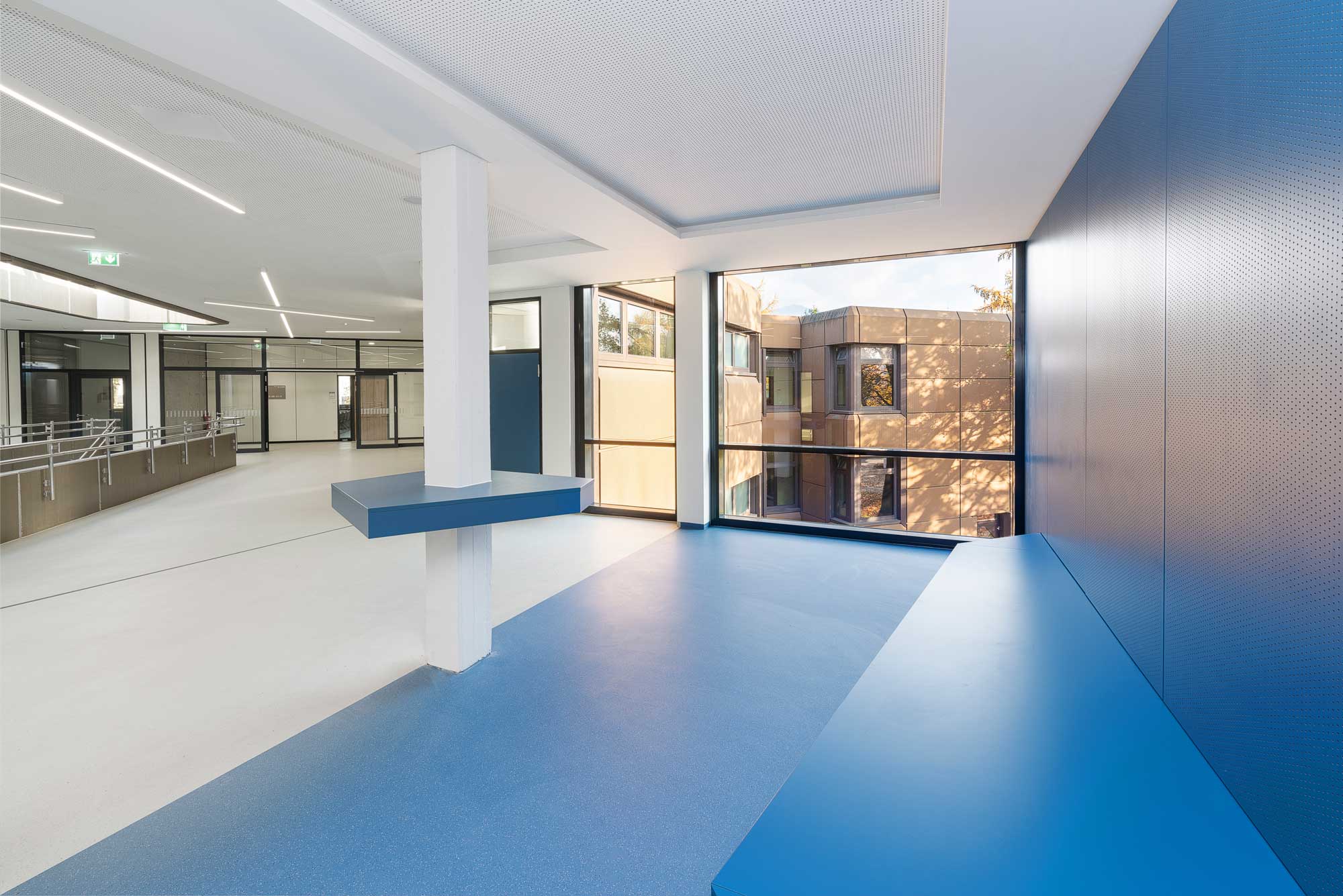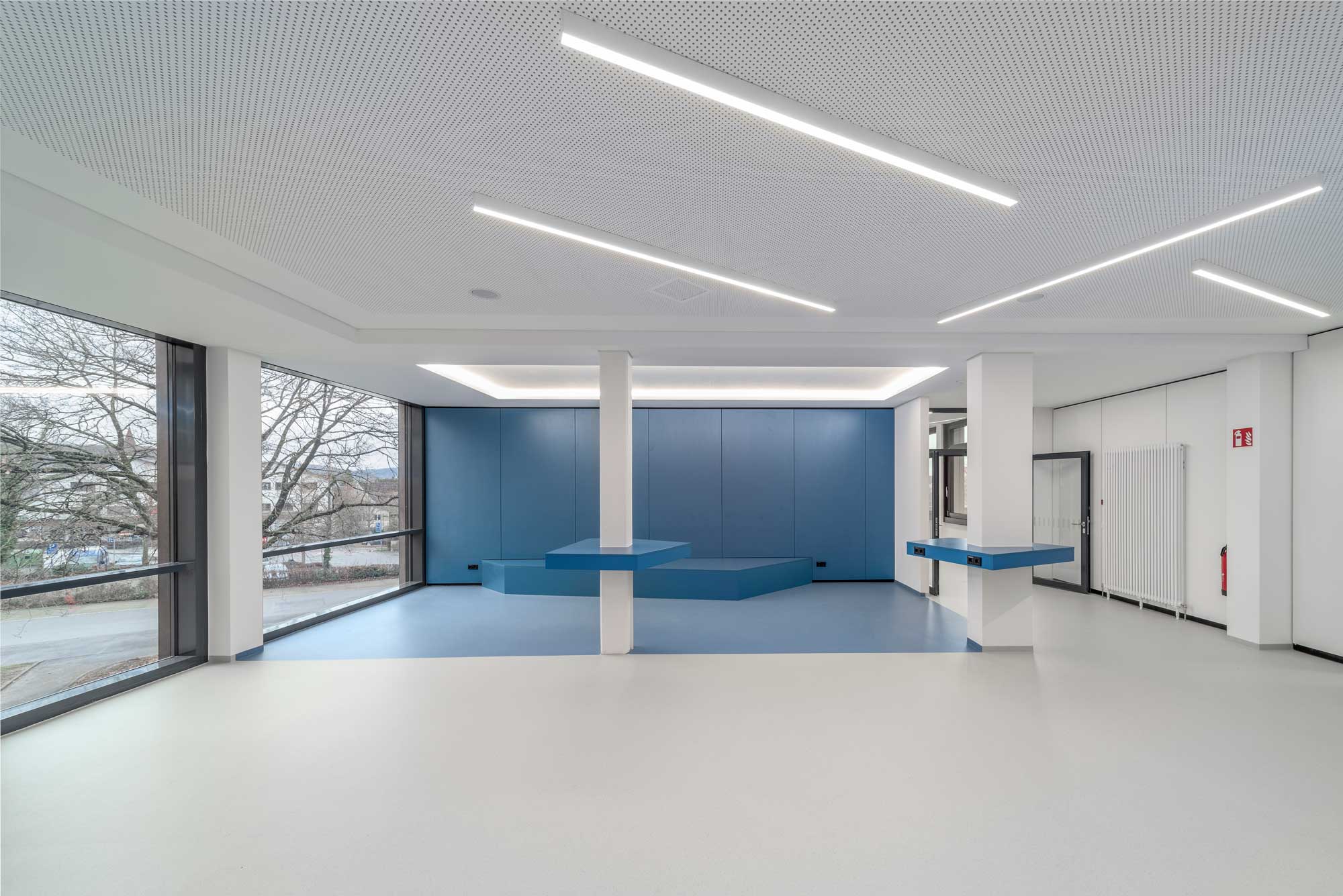 As part of the refurbishment, the building was comprehensively adapted to modern teaching and learning concepts. New specialist classrooms for chemistry, biology and physics as well as a caretaker's workshop and technology rooms were created in the basement. These rooms offer pupils modern equipment that meets the requirements of modern science education. On the ground floor, the existing rooms for general lessons have been reorganised and modernised. Particularly noteworthy is the new teaching kitchen, which has been specially equipped for educational purposes, as well as the new student café with adjoining kiosk. This area is separated from the break hall by a mobile partition wall, which can be converted into an event room if required. This flexible use offers pupils a wide range of options for organising breaks and school events.