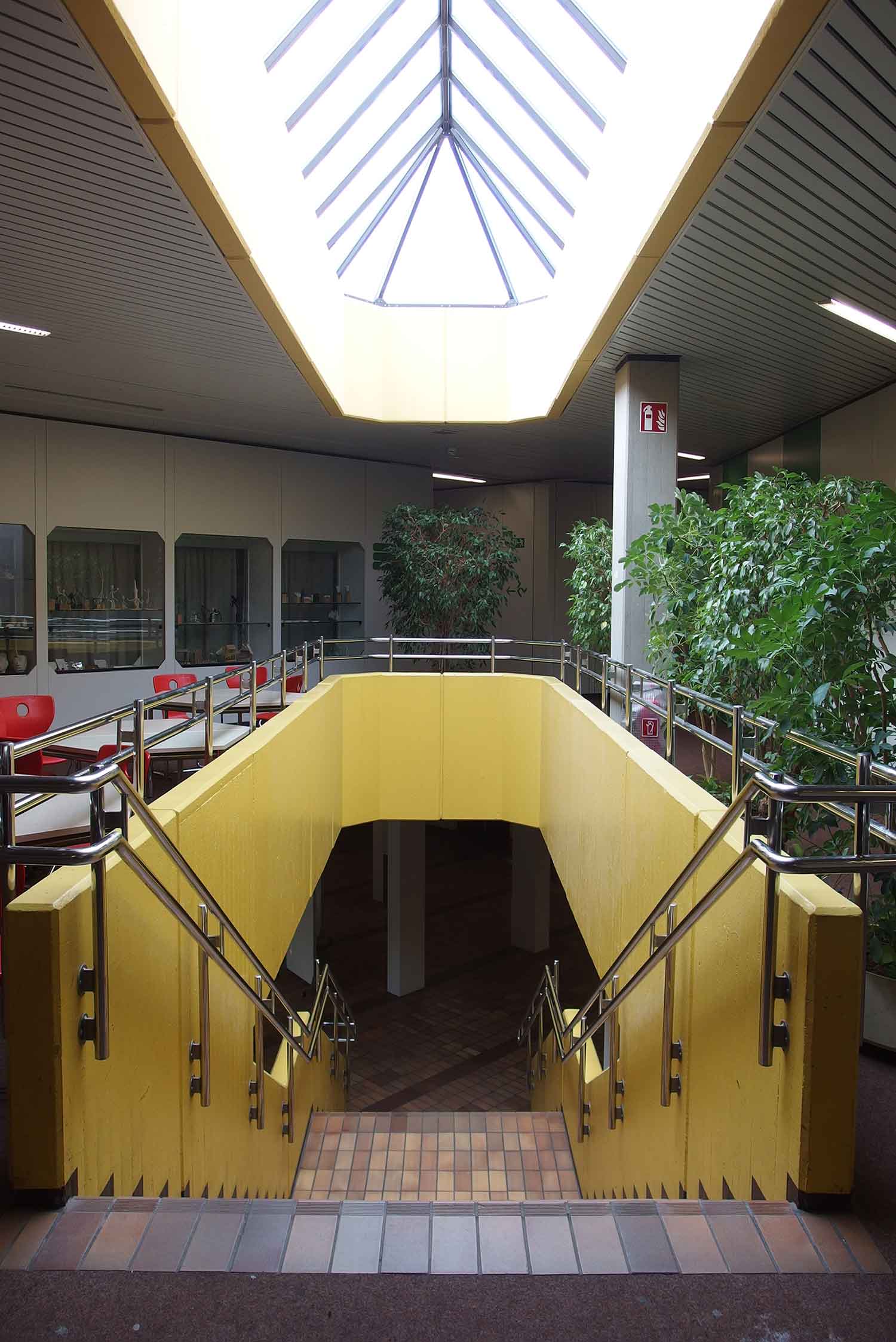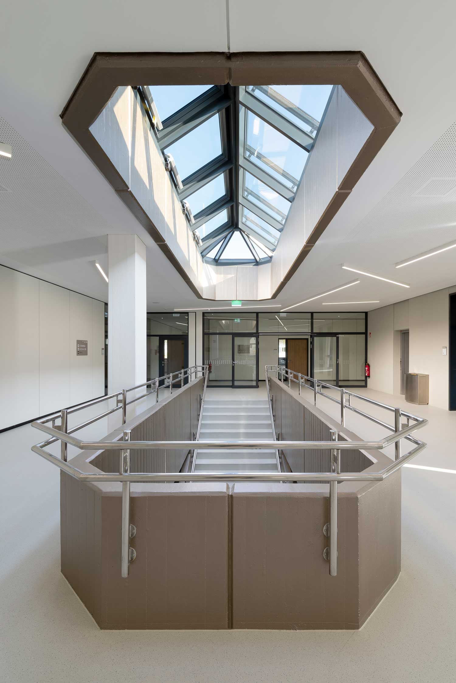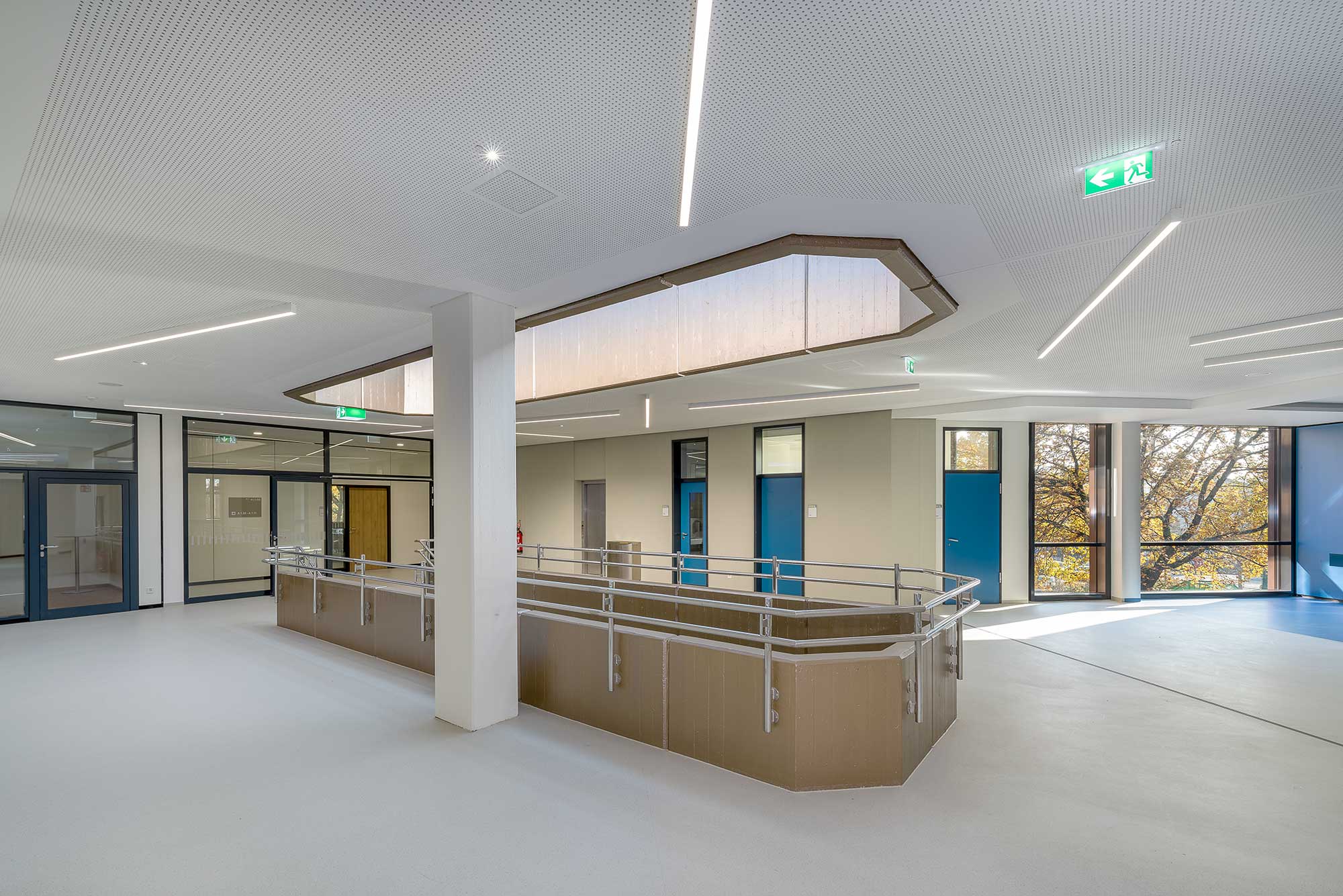 As part of the refurbishment, the building was comprehensively adapted to modern teaching and learning concepts. New specialist classrooms for chemistry, biology and physics as well as a caretaker's workshop and technology rooms were created in the basement. These rooms offer pupils modern equipment that meets the requirements of modern science education. On the ground floor, the existing rooms for general lessons have been reorganised and modernised. Particularly noteworthy is the new teaching kitchen, which has been specially equipped for educational purposes, as well as the new student café with adjoining kiosk. This area is separated from the break hall by a mobile partition wall, which can be converted into an event room if required. This flexible use offers pupils a wide range of options for organising breaks and school events.