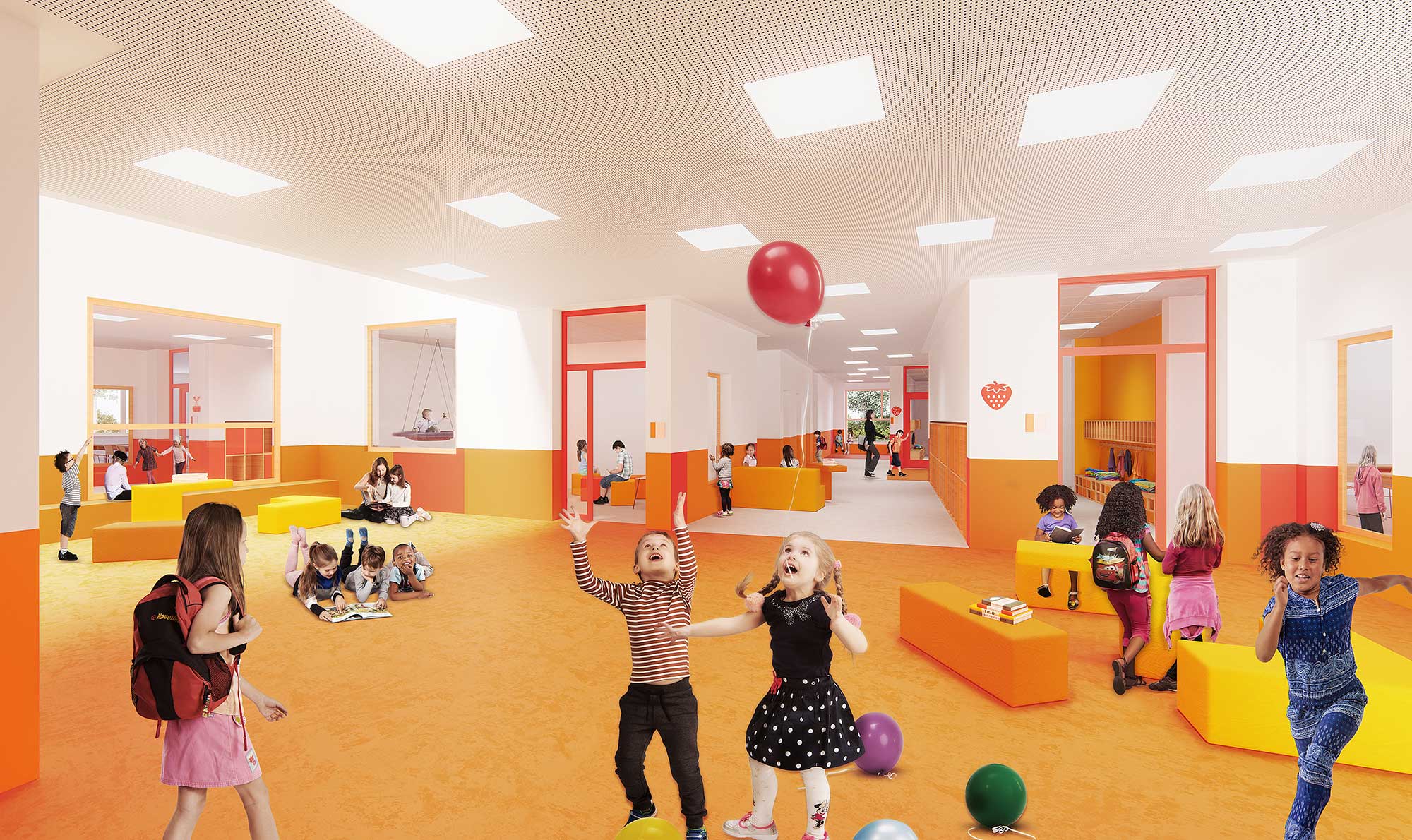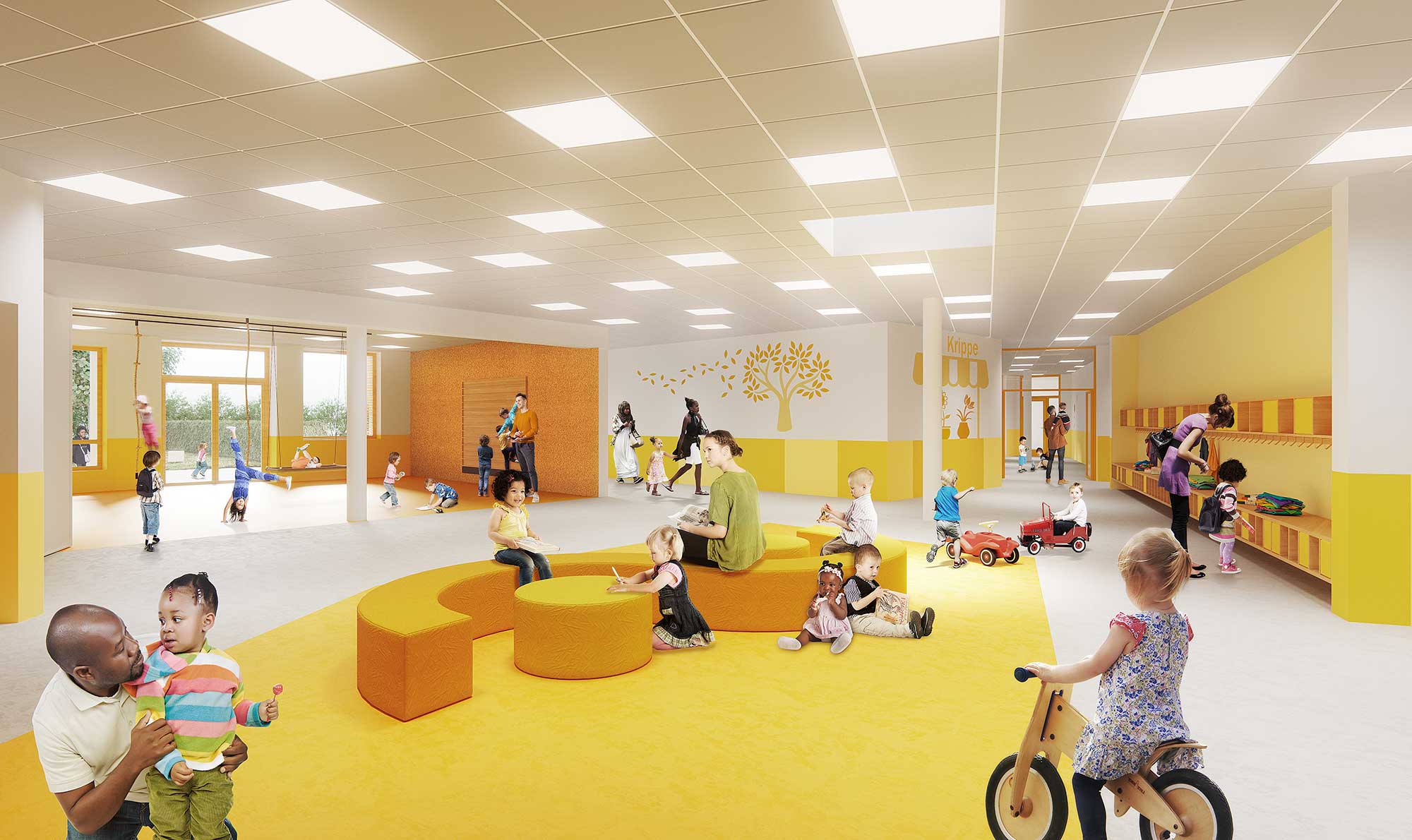 Located in the southern part of the new building, the daycare center scores with its ground-level location and direct connection to the foyer with a high degree of flexibility. The multi-purpose room and administration area are strategically positioned to ensure efficiency and safety. Clearly separated areas for the day nursery and kindergarden each offer their own play and eating zones, which create an open, communicative atmosphere thanks to glass panels and transparency. The two planned single-field sports halls are available to both pupils and district clubs. The direct connection to the primary school and the self-sufficient usage options ensure flexible and versatile use.