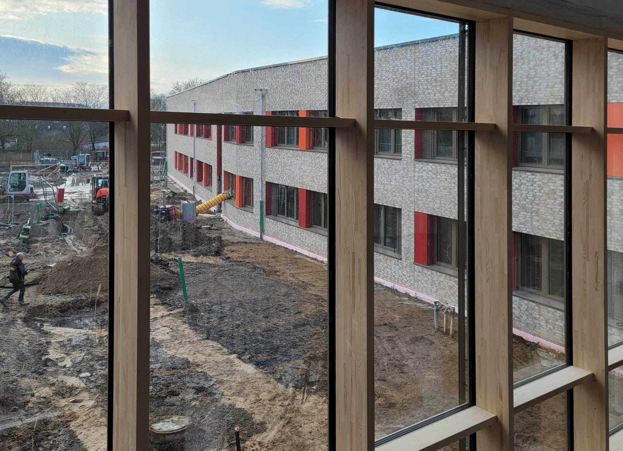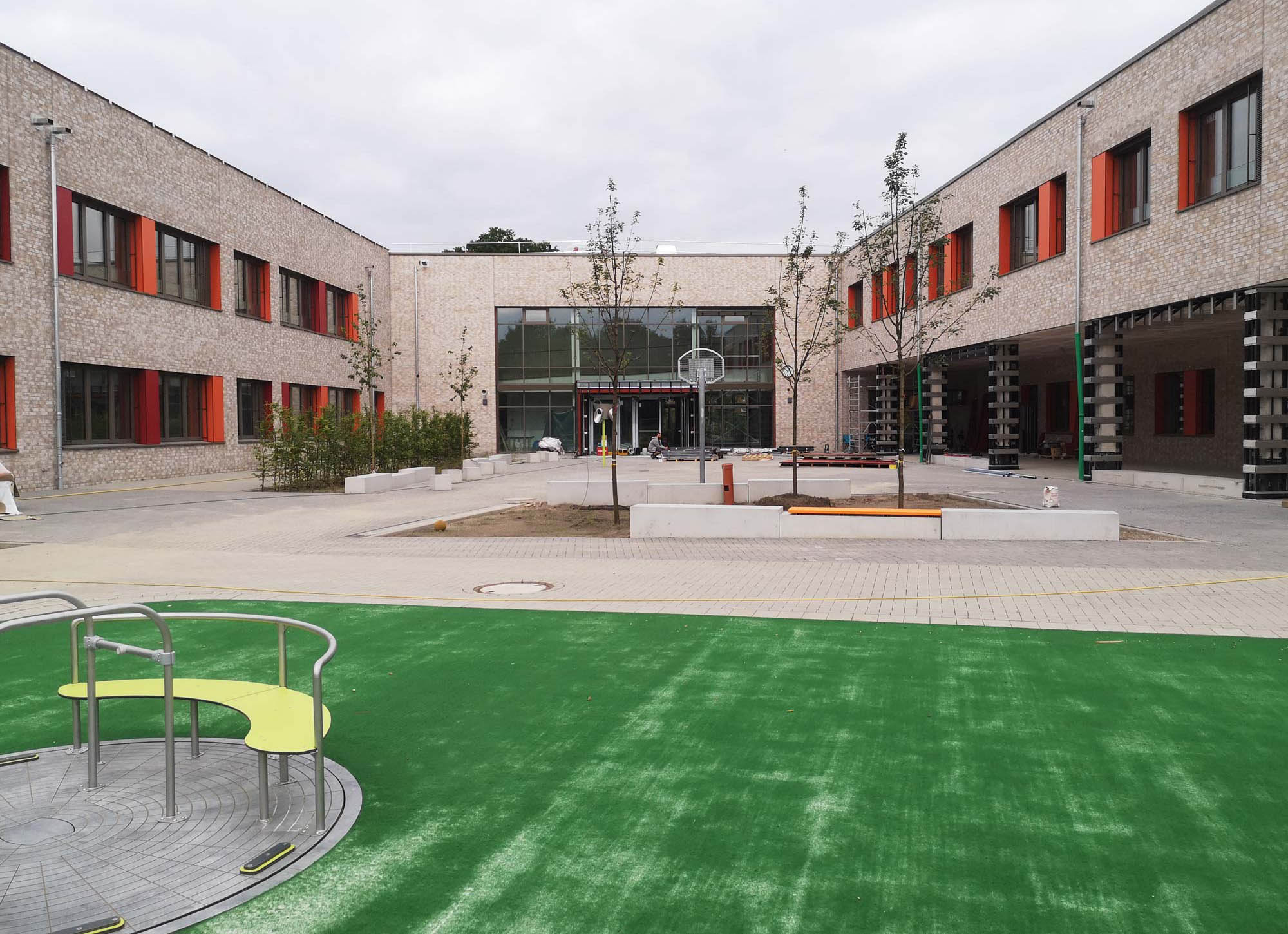 The new building is functionally divided into two construction phases: First, the primary school with forum, foyer, canteen and assembly hall was built in the northern section, followed by the sports hall and family center in the south. The arrangement of the functions creates a gradation from public to semi-public and private areas. The different parts of the building are connected by a central access corridor, which acts as a backbone and connecting element. The façades of the new building are made of beige clinker brick, which makes the different areas of use visible through different color accents and supports the identification of the users with the building.