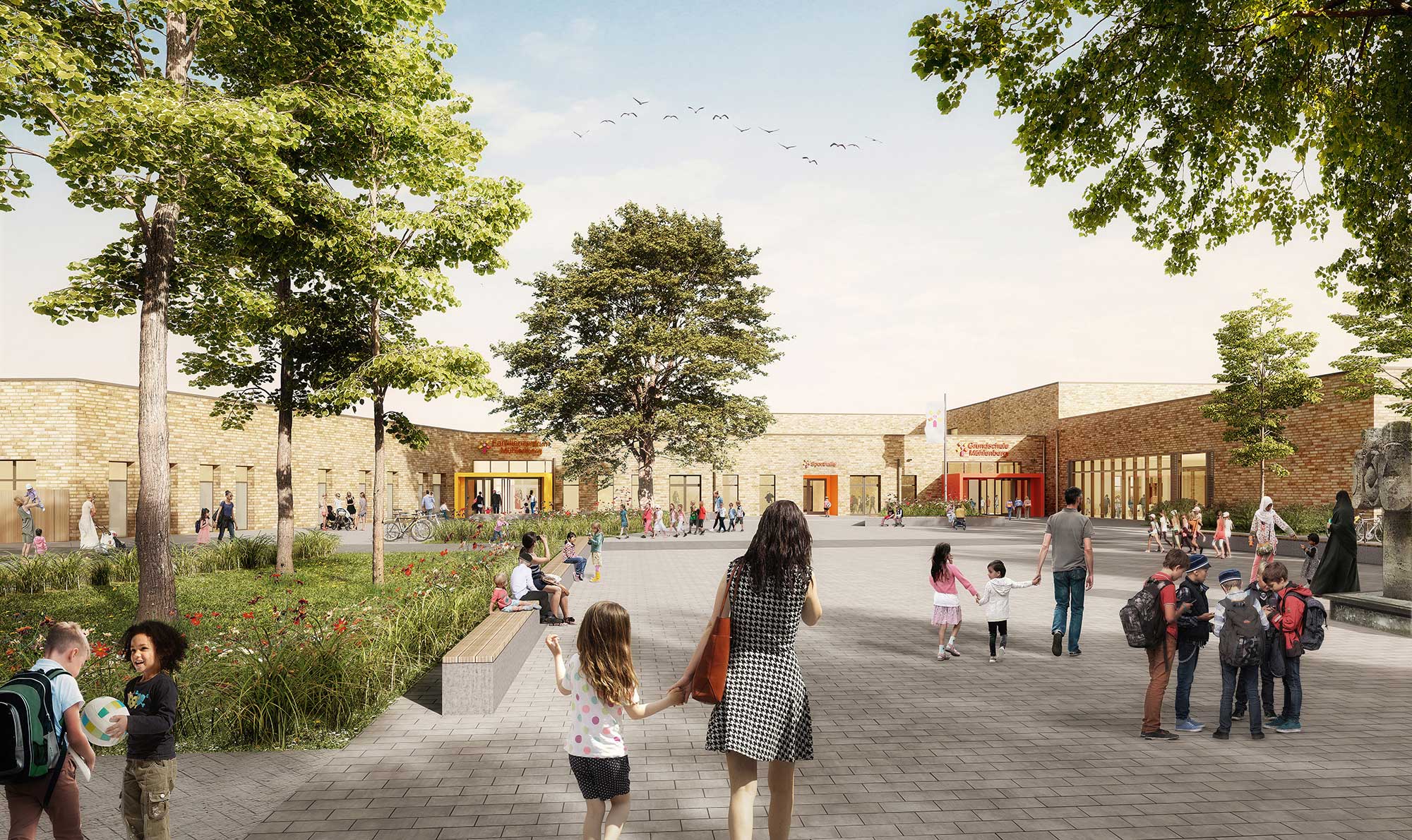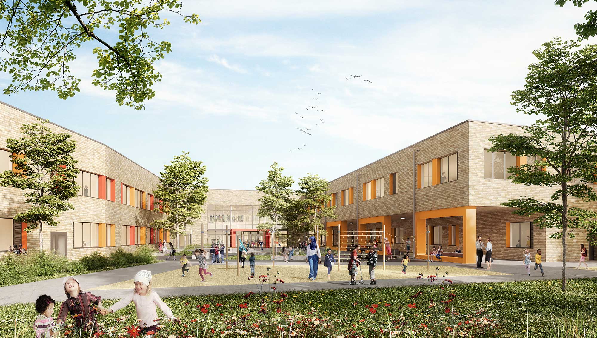 The new primary school is harmoniously integrated into the surrounding buildings and, with its two-storey structure, blends in with the neighboring terraced houses and residential buildings. Projections and recesses create a three-sided neighborhood square facing Leuschnerstraße, while a sheltered courtyard to the west serves as a retreat for the pupils. The trees, including an identity-forming plane tree, will be retained and supplemented by green islands.