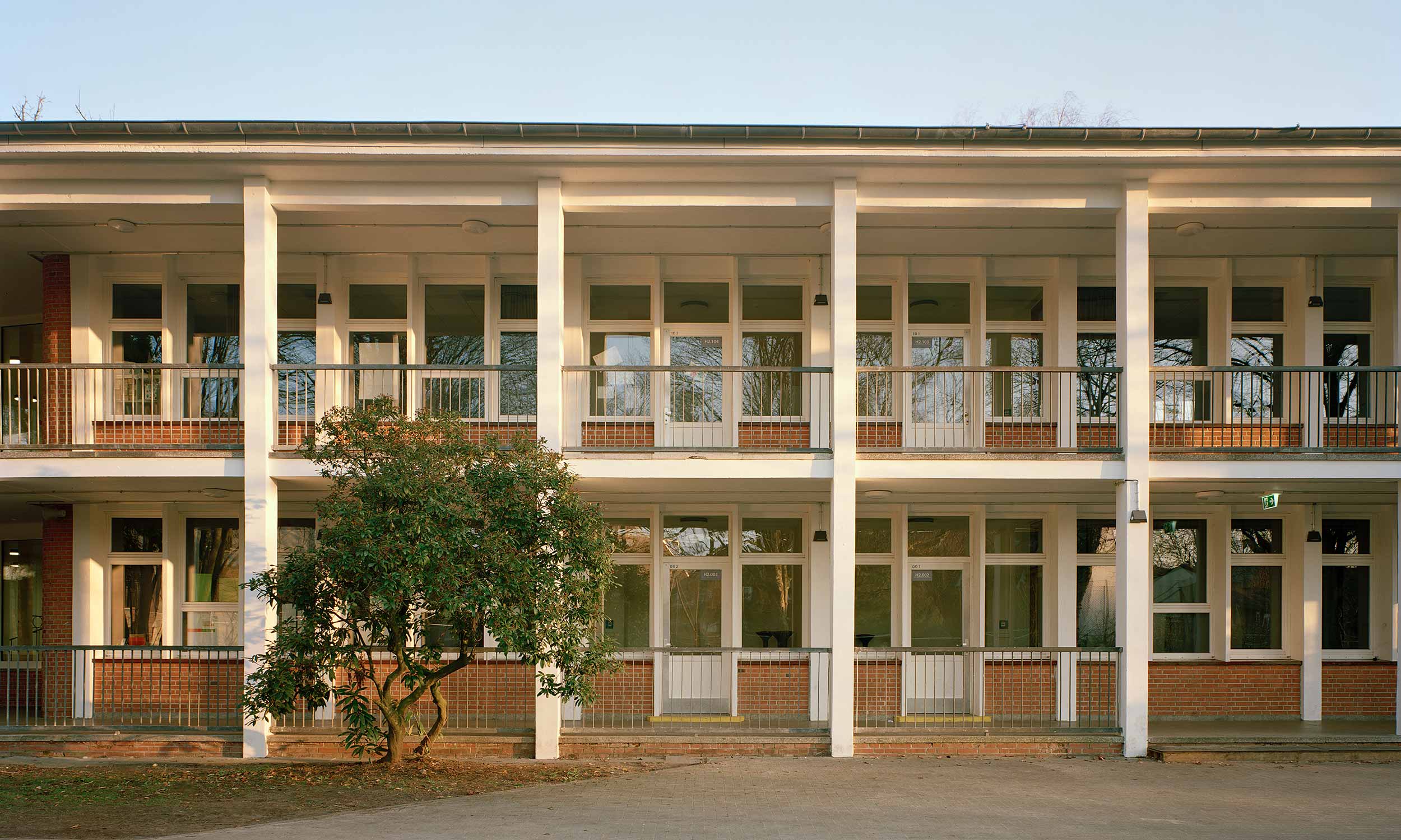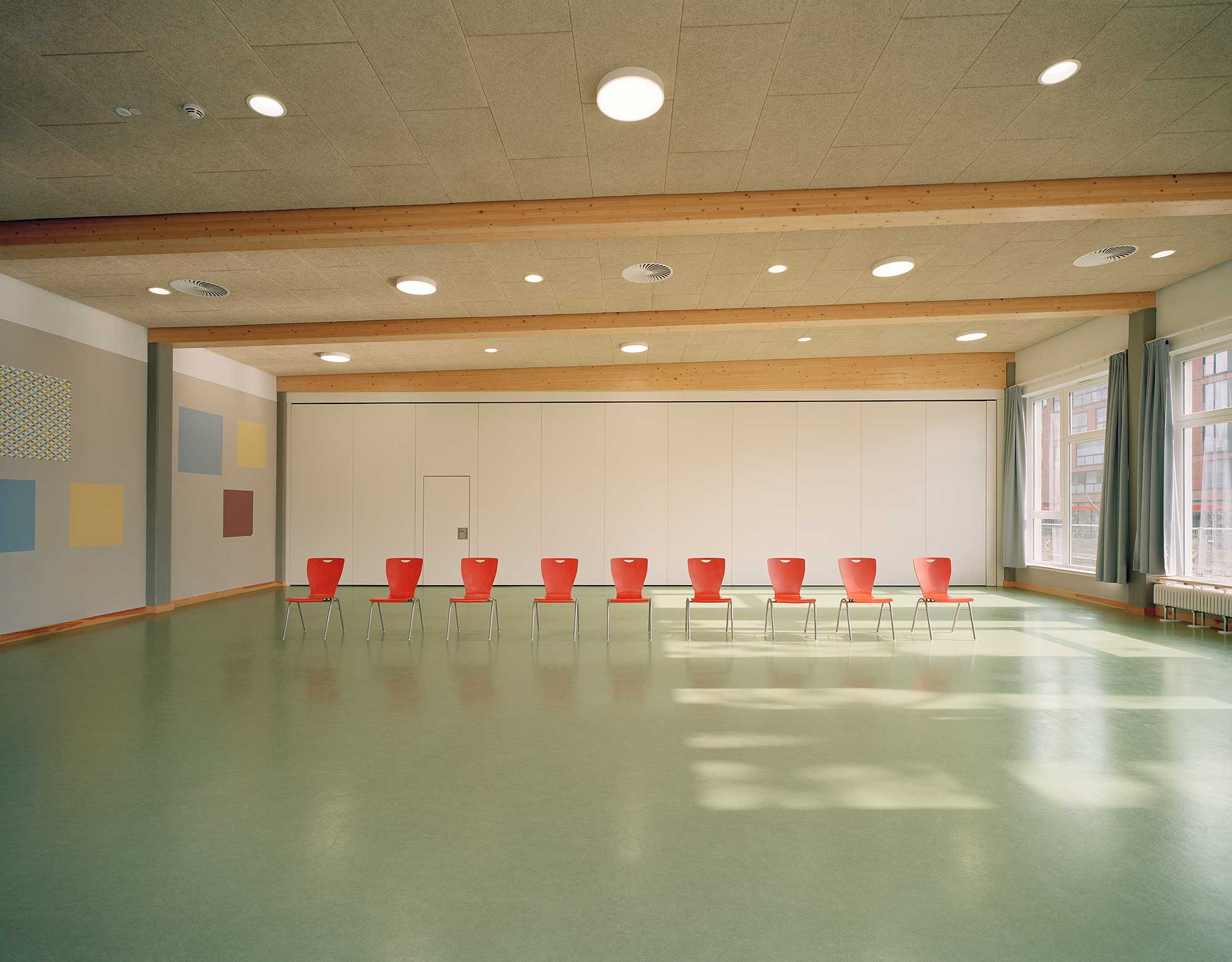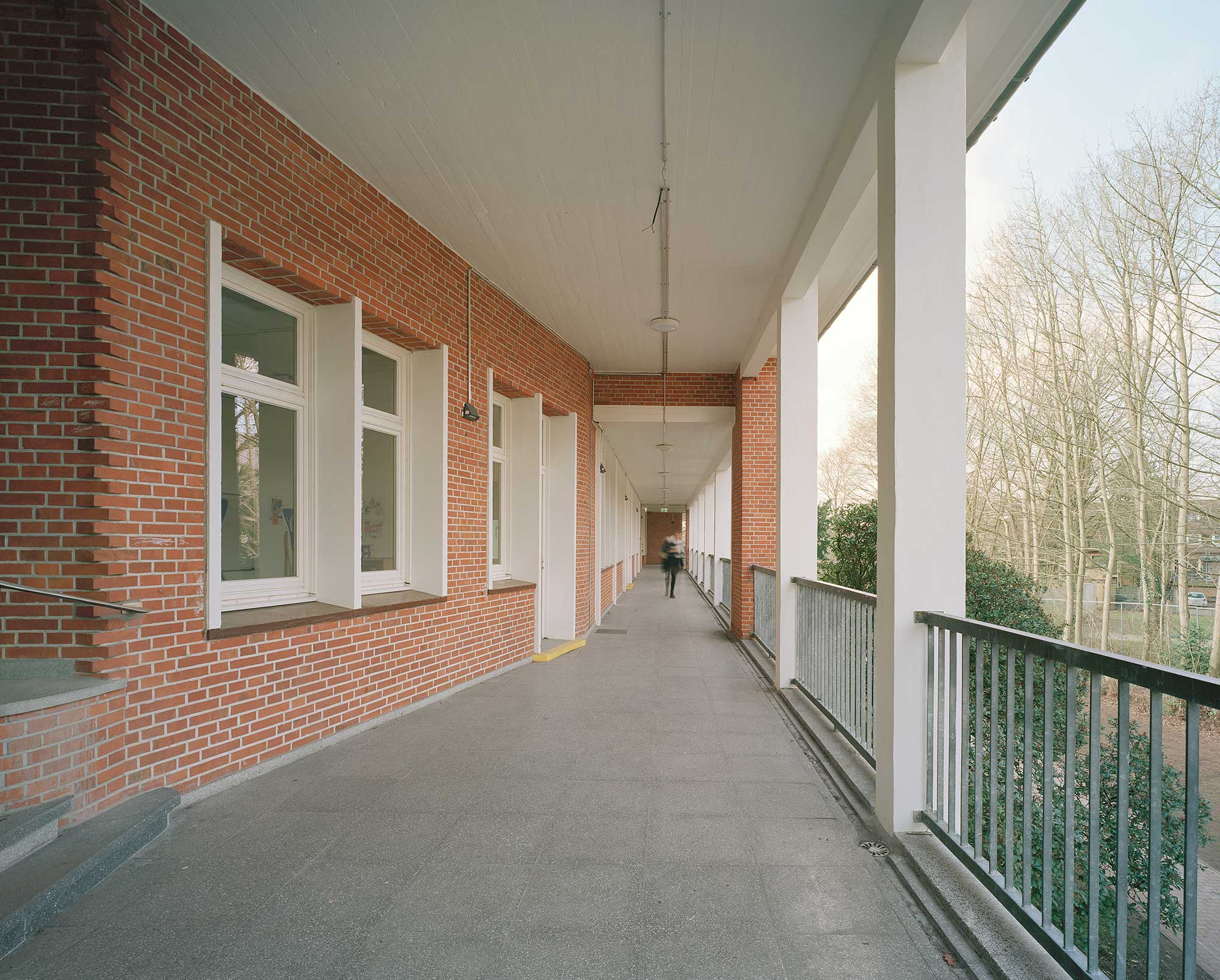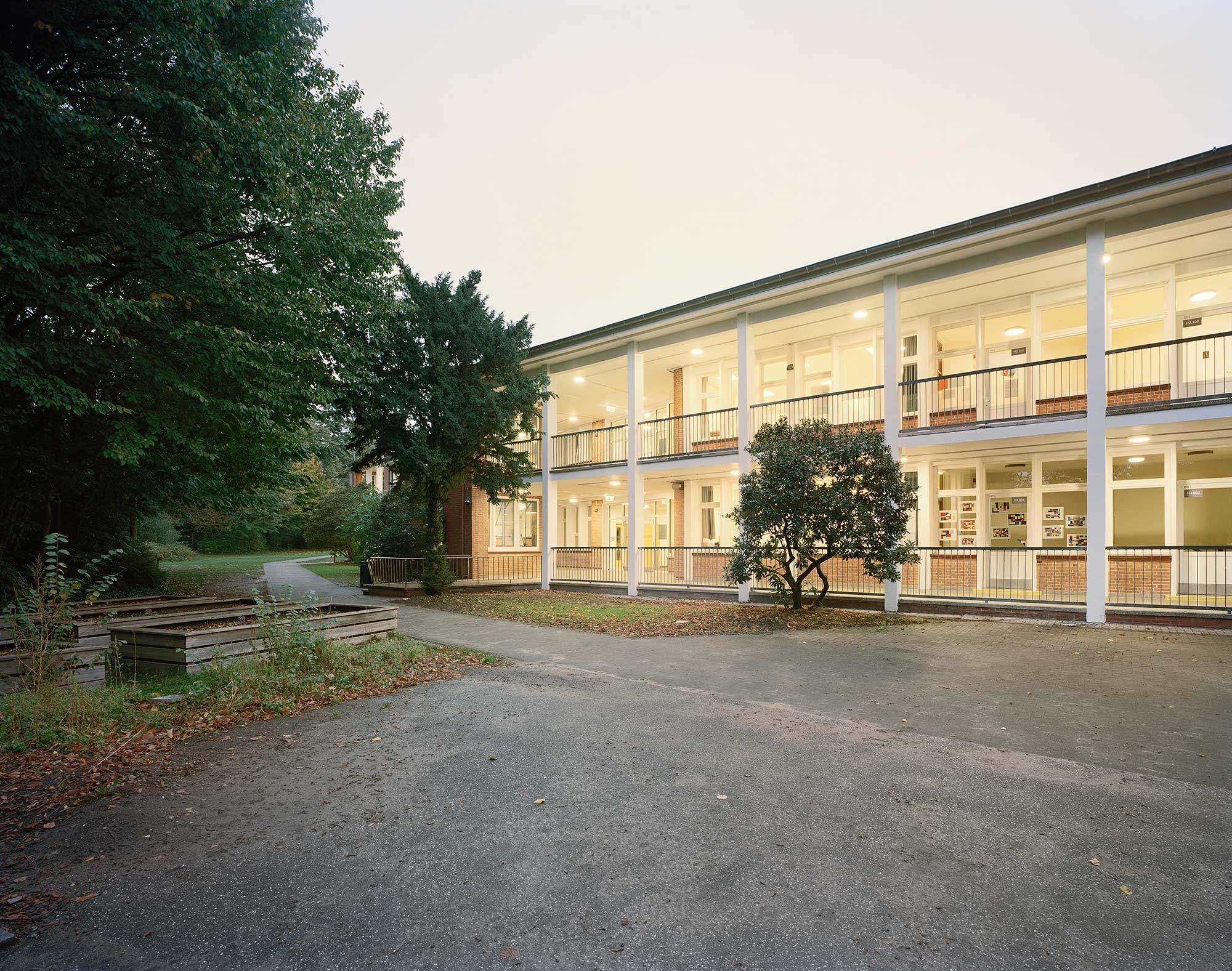 Bramfeld, the green and pastel district to the north-east of Hamburg's city center, almost forms its own city within the city with its independent infrastructure and over 50,000 residents. More than a century after the original construction of the Bramfeld district school and several conversions, it was time for a comprehensive refurbishment including the addition of a break hall. The ageing building complex is undergoing a transformation that honors its historical significance and at the same time paves the way for modern educational concepts. An extensive inspection and assessment of the existing condition formed the basis of the project.