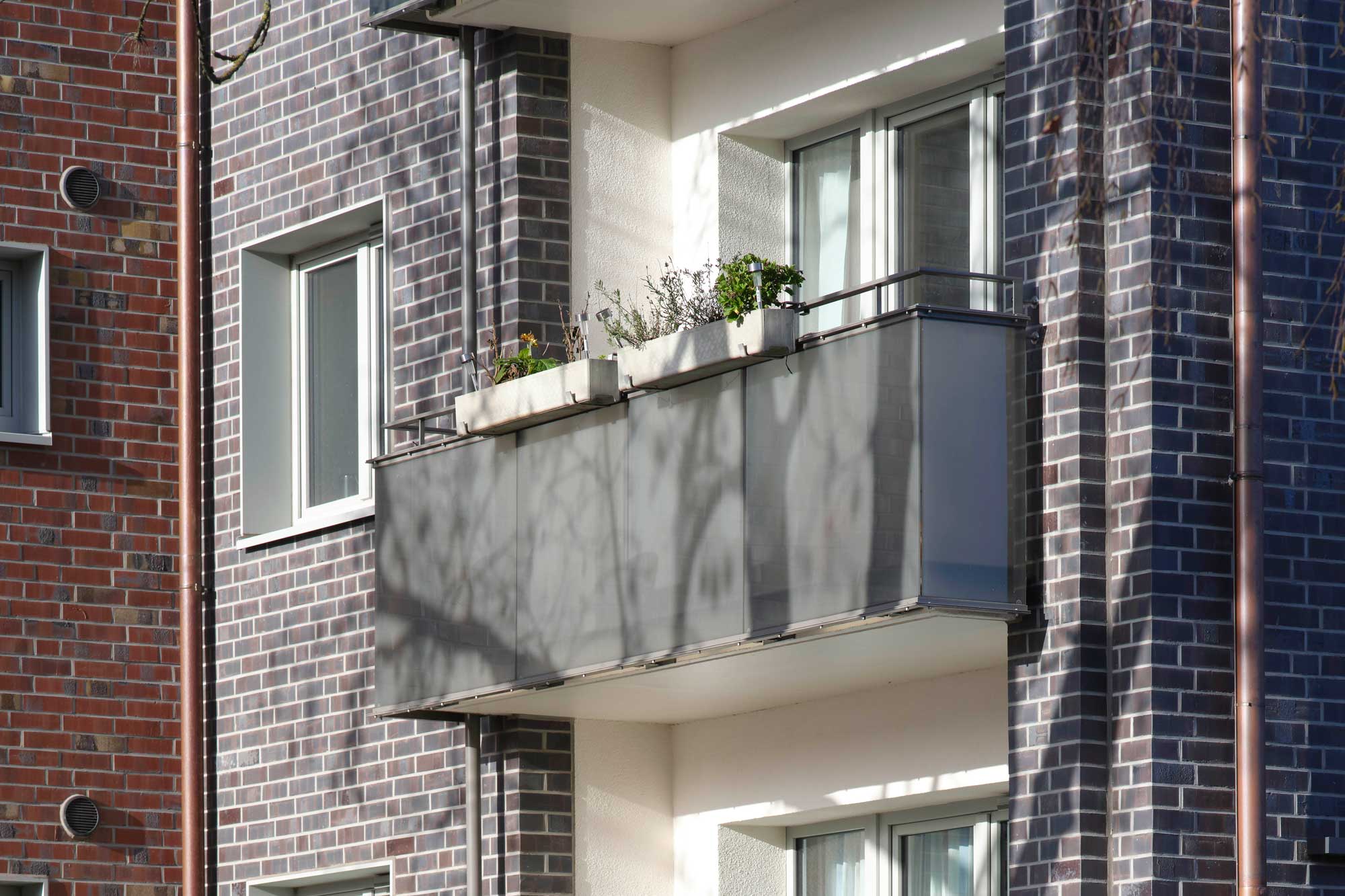 The seven- to eight-storey residential complex impresses with its harmonious façade design, in which dark clinker brick slips adorn the main body of the residential building. The street-facing part of the building on the eighth floor stands out with light-coloured clinker brick slips, creating an exciting contrast. Metallic elements on the balcony parapets, on the sides of the windows and as horizontal accents lighten up the façade and give it a modern touch.