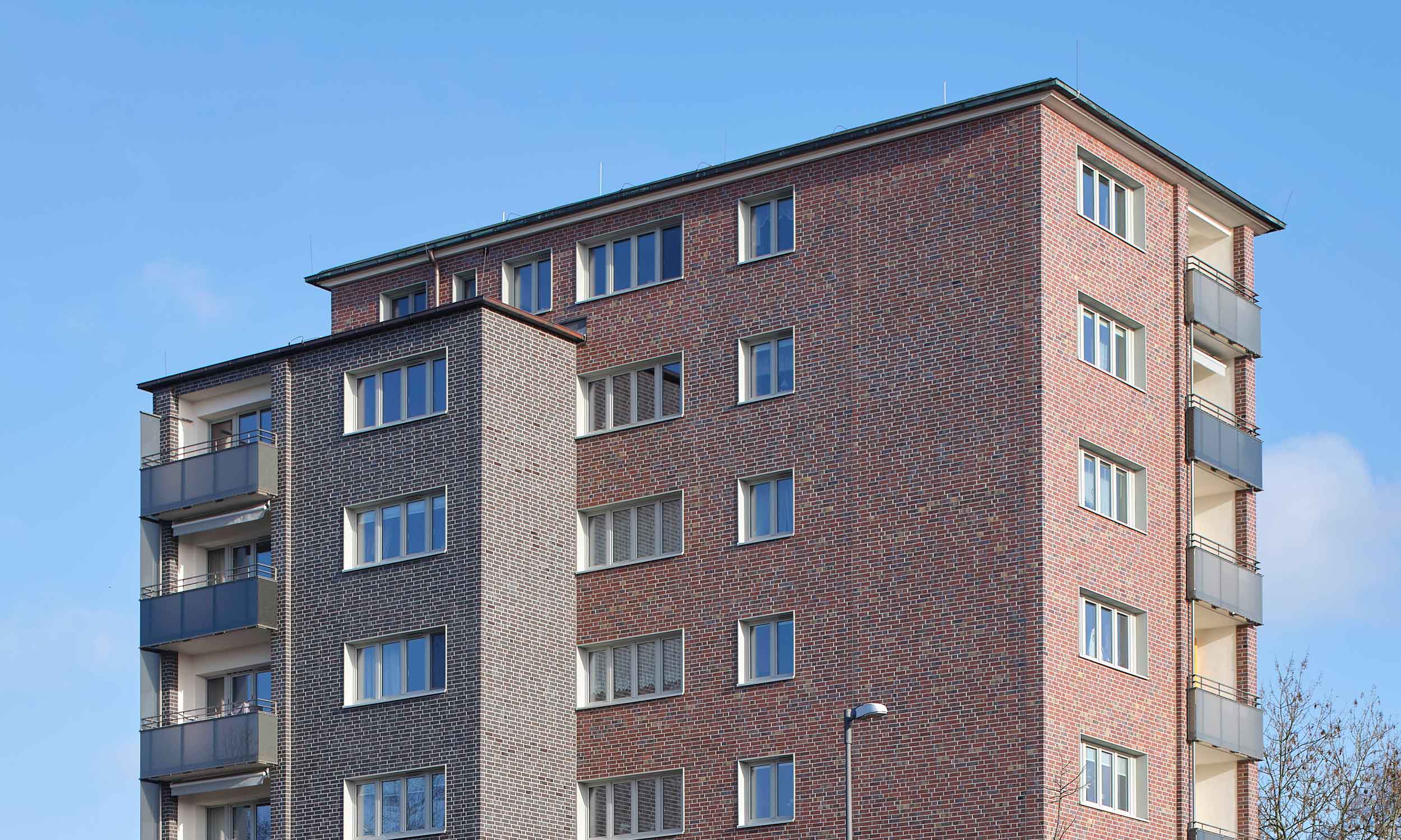The tower block built in the 1960s in Hamburg's Finkenwerder district, not far from Köhlfleet, shines in new splendour following extensive energy-efficient refurbishment. The façade was carefully modernised with a focus on preserving the original character while at the same time adapting it to modern standards. Clinker brick slips, which create a reference to the surrounding buildings, characterise the new appearance and give the building a contemporary yet familiar look.