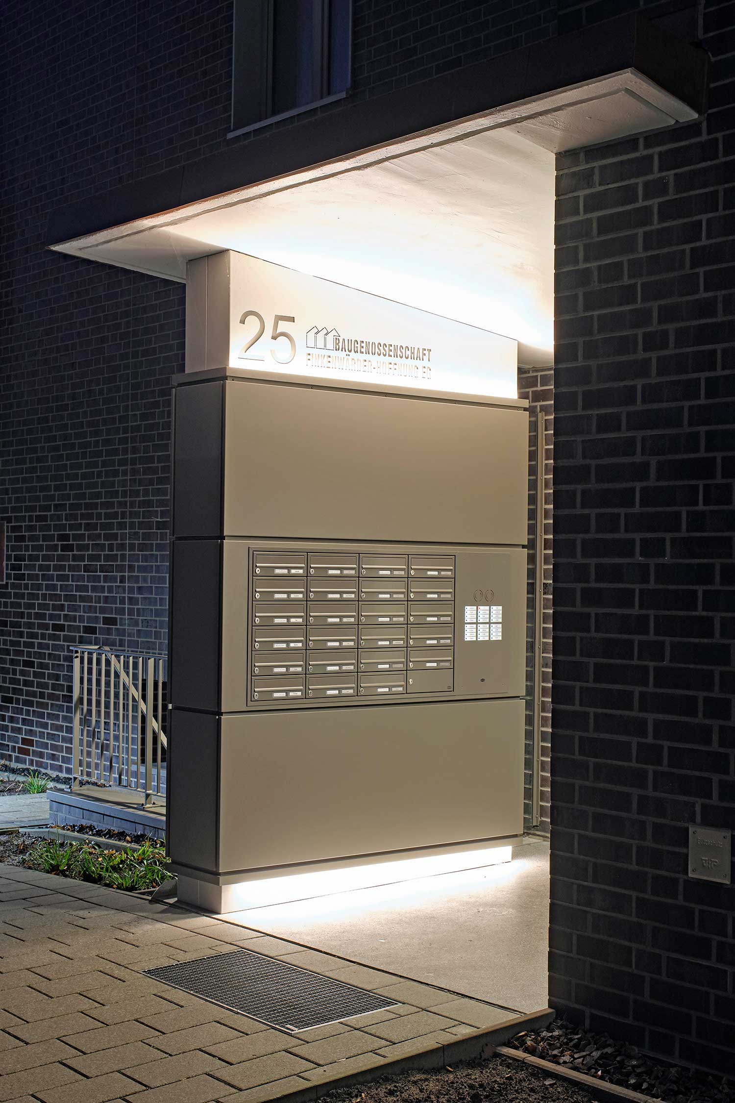 The entrance area was also upgraded as part of the modernisation. A new front door, a partition wall with metal panelling and the integration of a modern letterbox system and doorbell panel give the tower block a contemporary and inviting appearance.