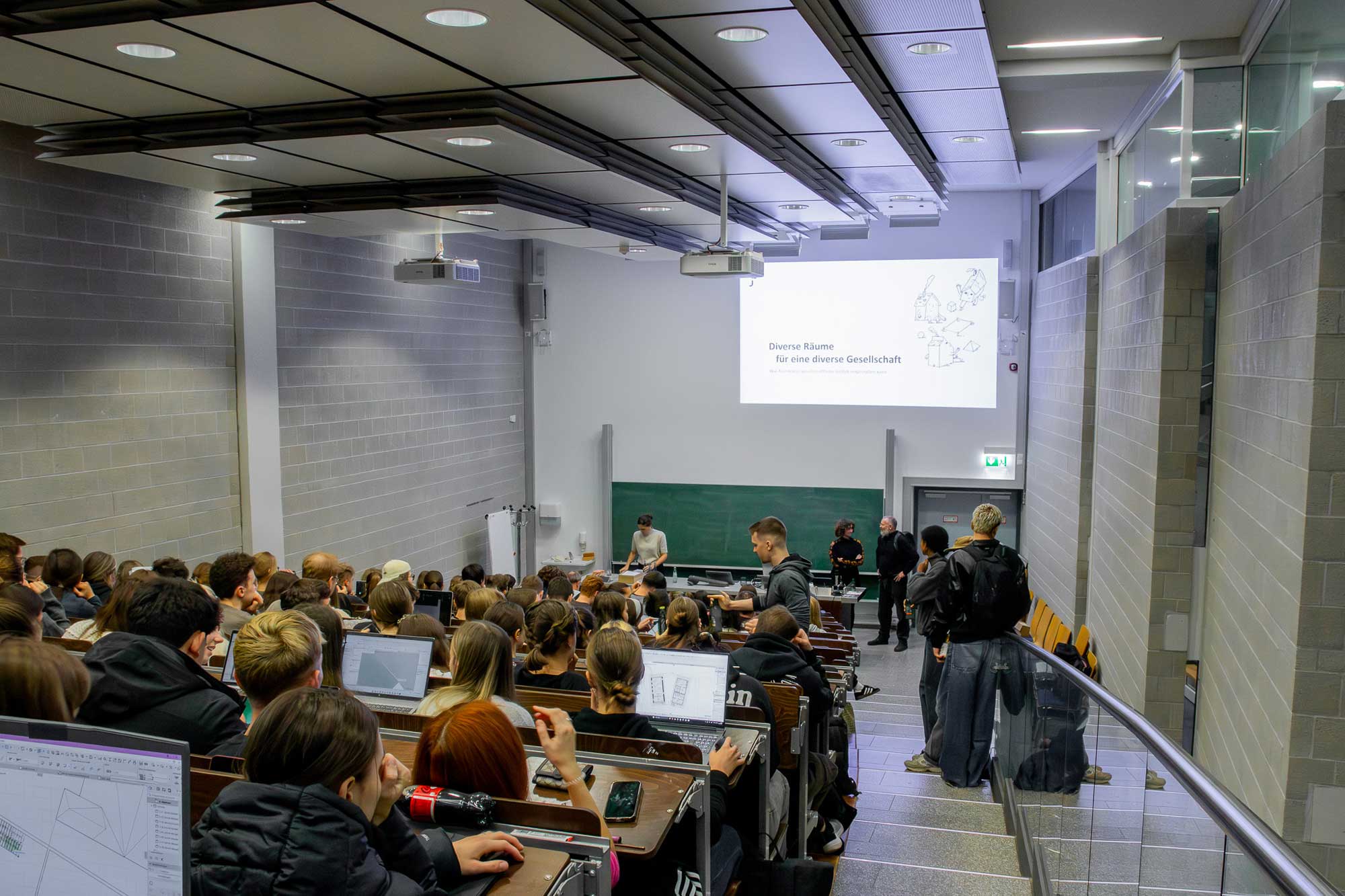 Im Anschluss entstand ein lebendiger Austausch mit einigen der rund 200 Studierenden, die das Thema mit großem Interesse begleiteten und unsere Partizipationskarten nutzten, um eigene Perspektiven auf die Frage einzubringen, welche Räume Menschen brauchen, um sich zugehörig zu fühlen und wachsen zu können.