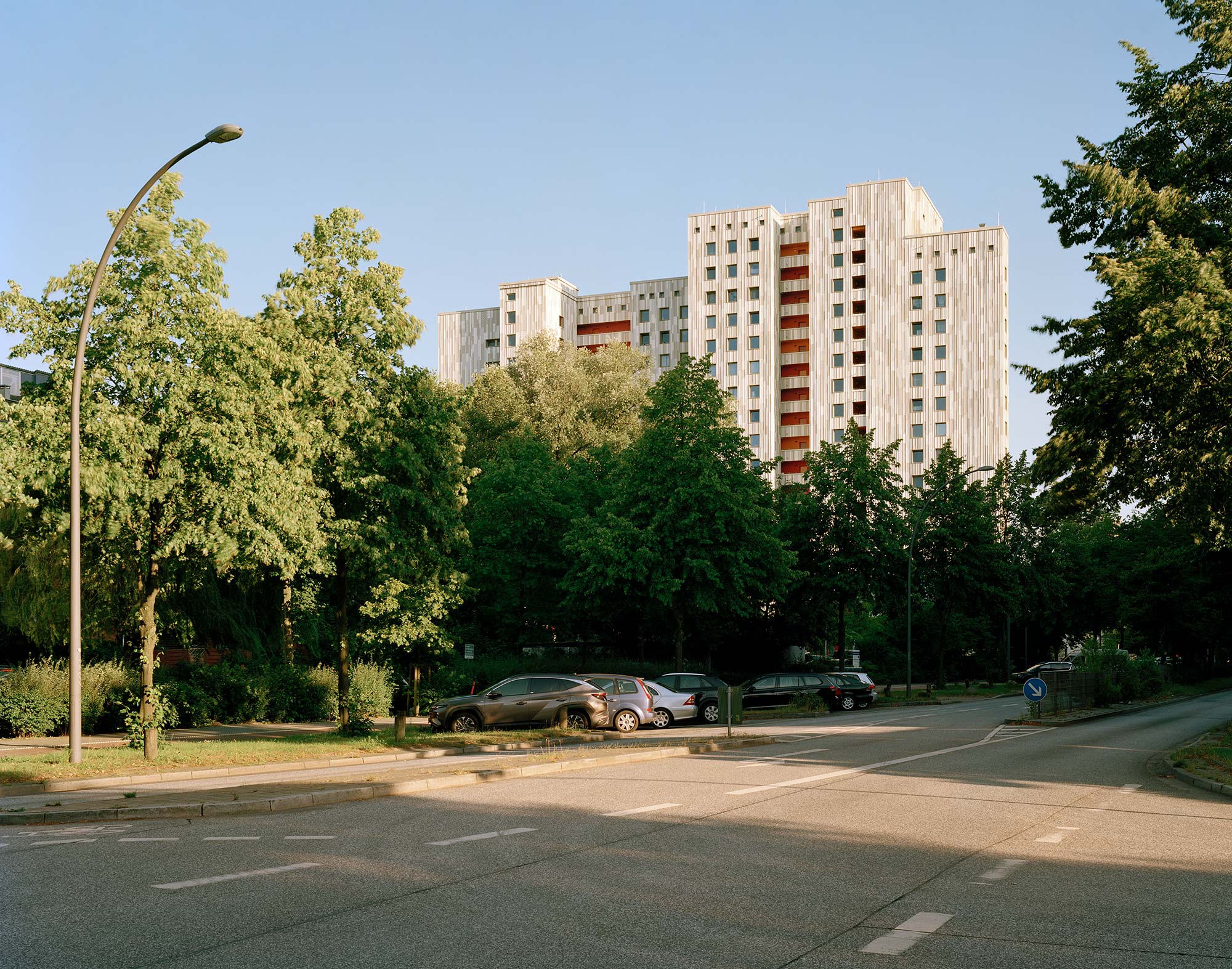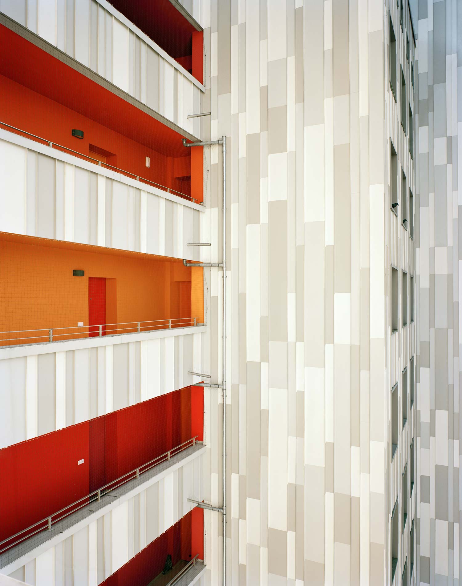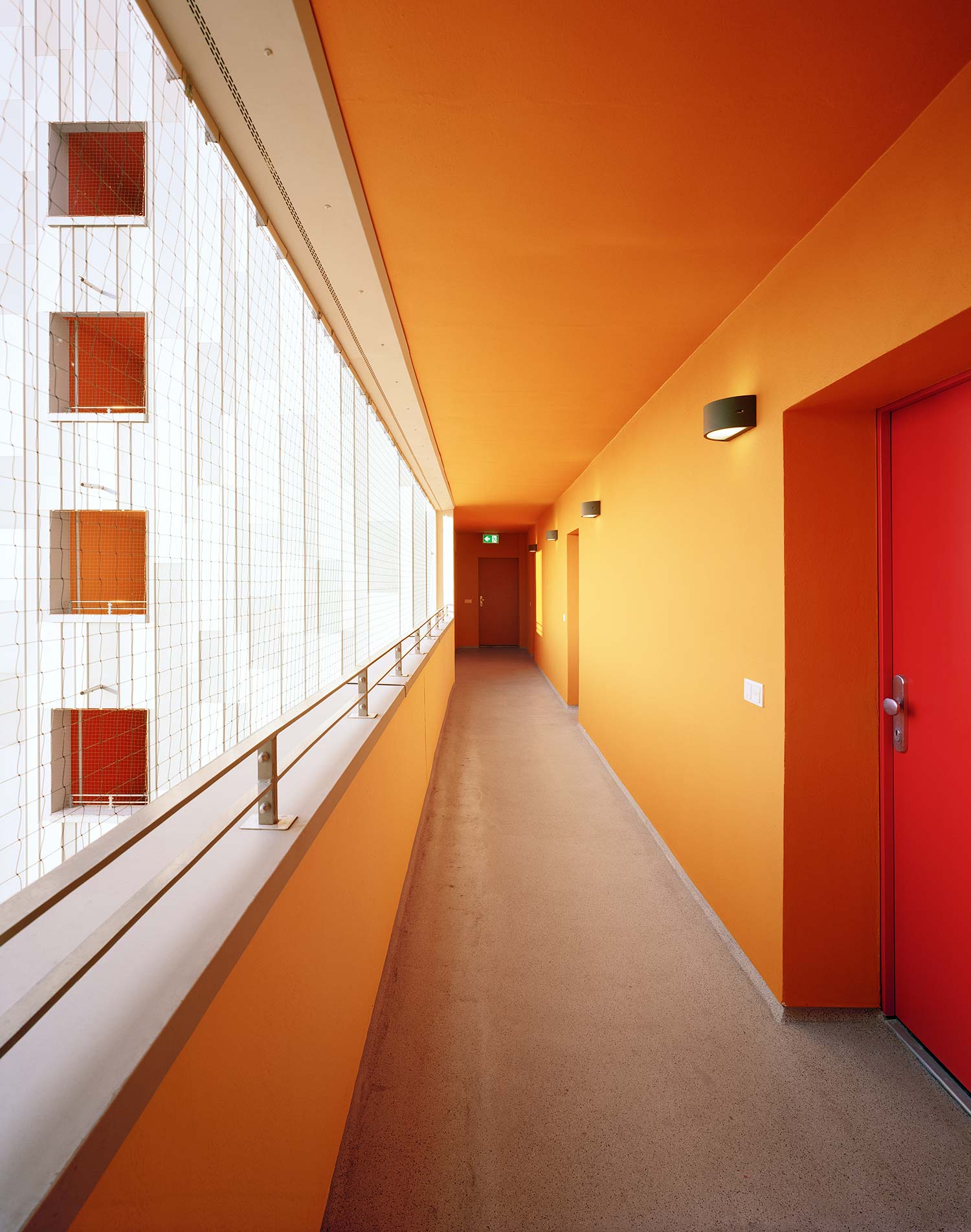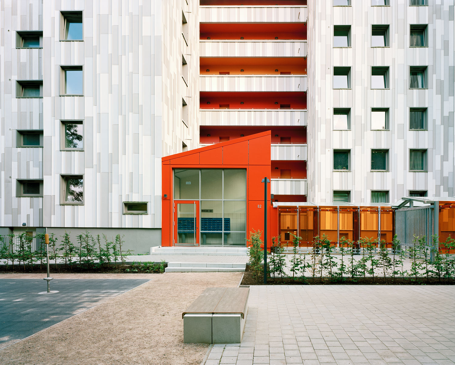 Stadteinwärts führt kein Blick am Wohnhochhaus Bornheide vorbei. Grund genug, das ehemals monotone Erscheinungsbild mit bewusst gewählten Farbakzenten zu versehen, um den bunten und lebendigen Stadtteil auch an der stadtbildprägenden Fassade widerzuspiegeln. Die glänzenden Balkonelemente sind farbenprächtig und ähneln in den unterschiedlichen Rottönen zur richtigen Tageszeit einem prächtigen Sonnenuntergang inmitten der Stadt. Die Wandfarben der Laubengänge auf der Nordseite der Fassade greifen die jeweiligen Farbtöne auf.