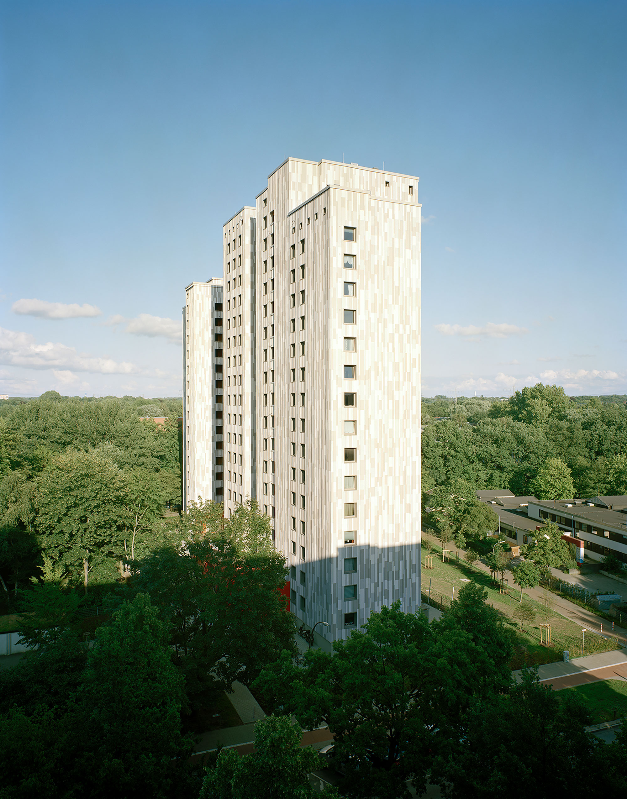 Um dem Gebäudeblock als solches die Massivität zu nehmen, besteht der Großteil der Metallfassade aus kontrastarmen, changierenden Grautönen. Durch Vor- und Rücksprünge, Balkone und Treppenkerne besteht der Baukörper aus 46 einzelnen Fassadenflächen, für die insgesamt 17.855 Schare, also Metallbänder, in unterschiedlichen Grautönen, Breiten und Längen produziert wurden. Die Metallplatten sind hochwertig und widerstandsfähig und erfüllen mit der ebenfalls erneuerten Dämmschicht alle Brandschutz- und energetischen Richtlinien. Zuvor bestand die Dämmschicht hinter der Fassade aus gepressten Holzspänen, die brennbar sind und im Rahmen einer Fassadenuntersuchung 2017 unverzüglich ausgetauscht werden mussten.