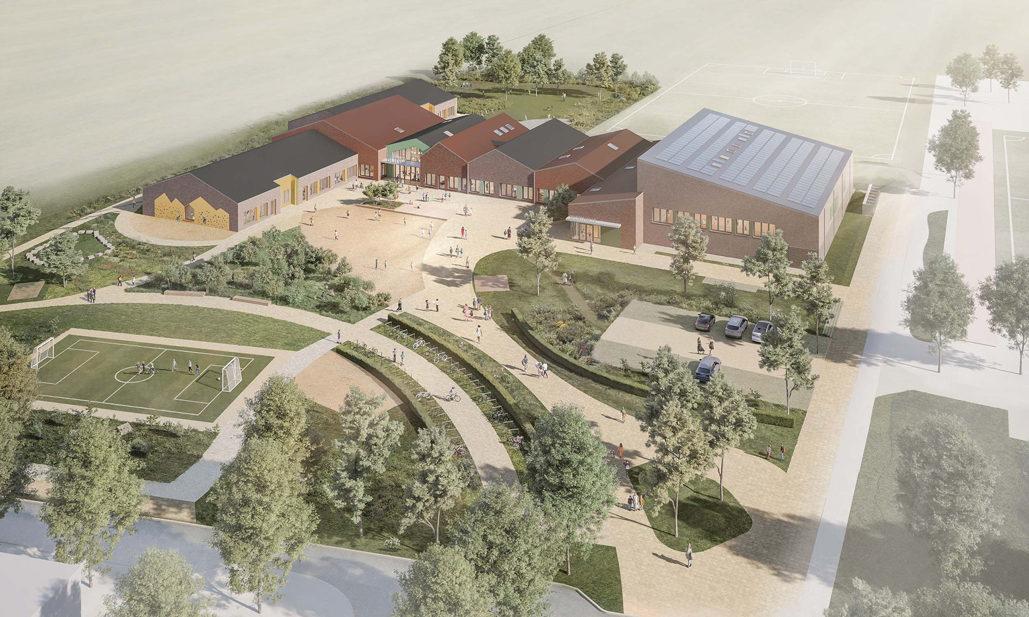 Der Neubau vereint Historie und Moderne in einer klaren, kubischen Formensprache. Die Fassade greift die Materialien und Farbigkeit der Bestandsbauten auf: Roter Klinker dominiert das Erscheinungsbild, während blaue Fassadenplatten Akzente setzen und markante Bereiche wie den Haupteingang oder das Lehrer:innenzimmer betonen. Diese Elemente schaffen nicht nur Verbindungen zu den bestehenden Gebäuden, sondern verleihen dem Neubau auch eine eigenständige Identität. Der Übergang zwischen den Gebäuden wird durch ein eingeschossiges Foyer mit Haupteingang gestaltet, das Besucher:innen willkommen heißt und das neue Herzstück des Campus bildet.