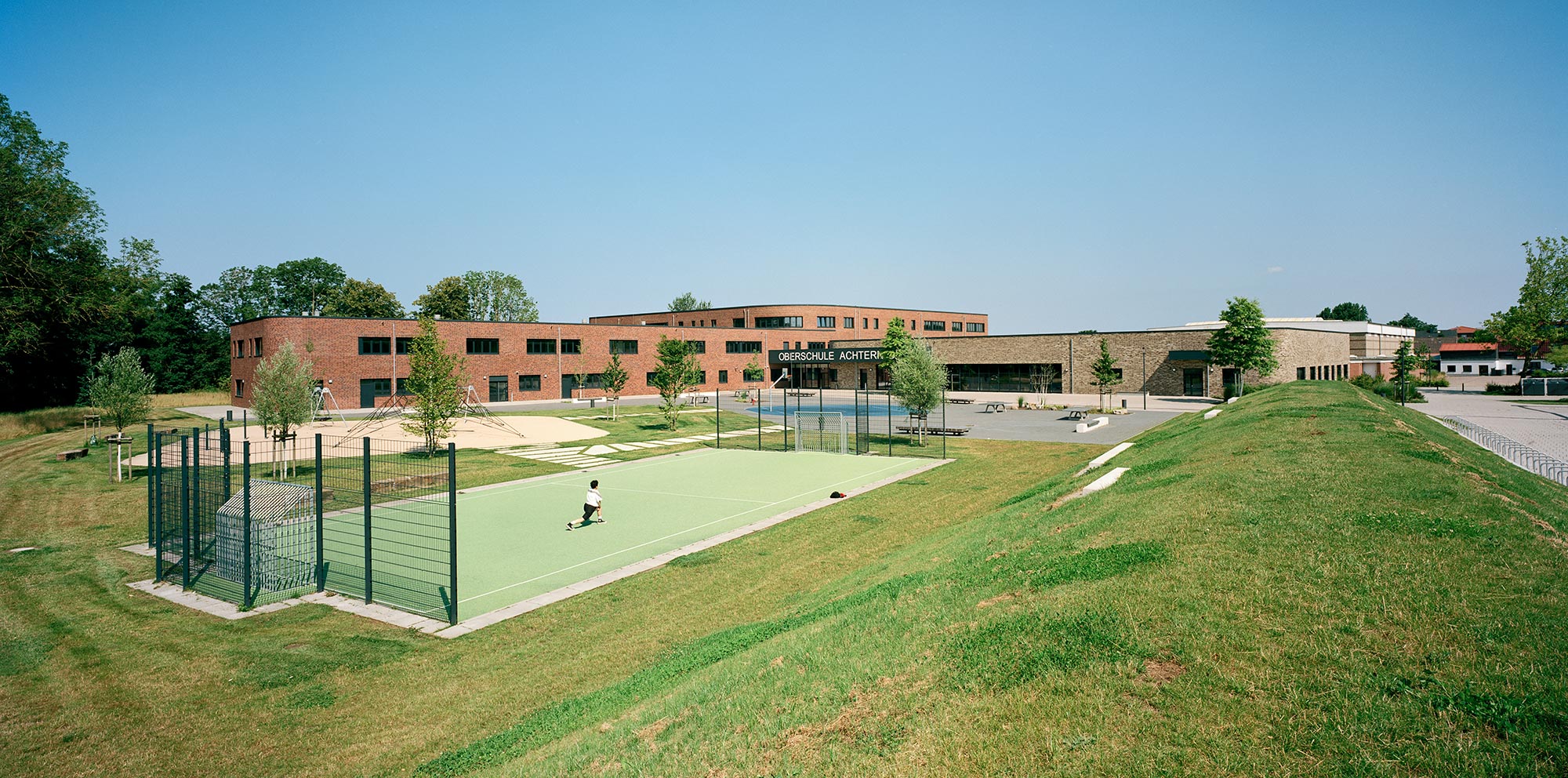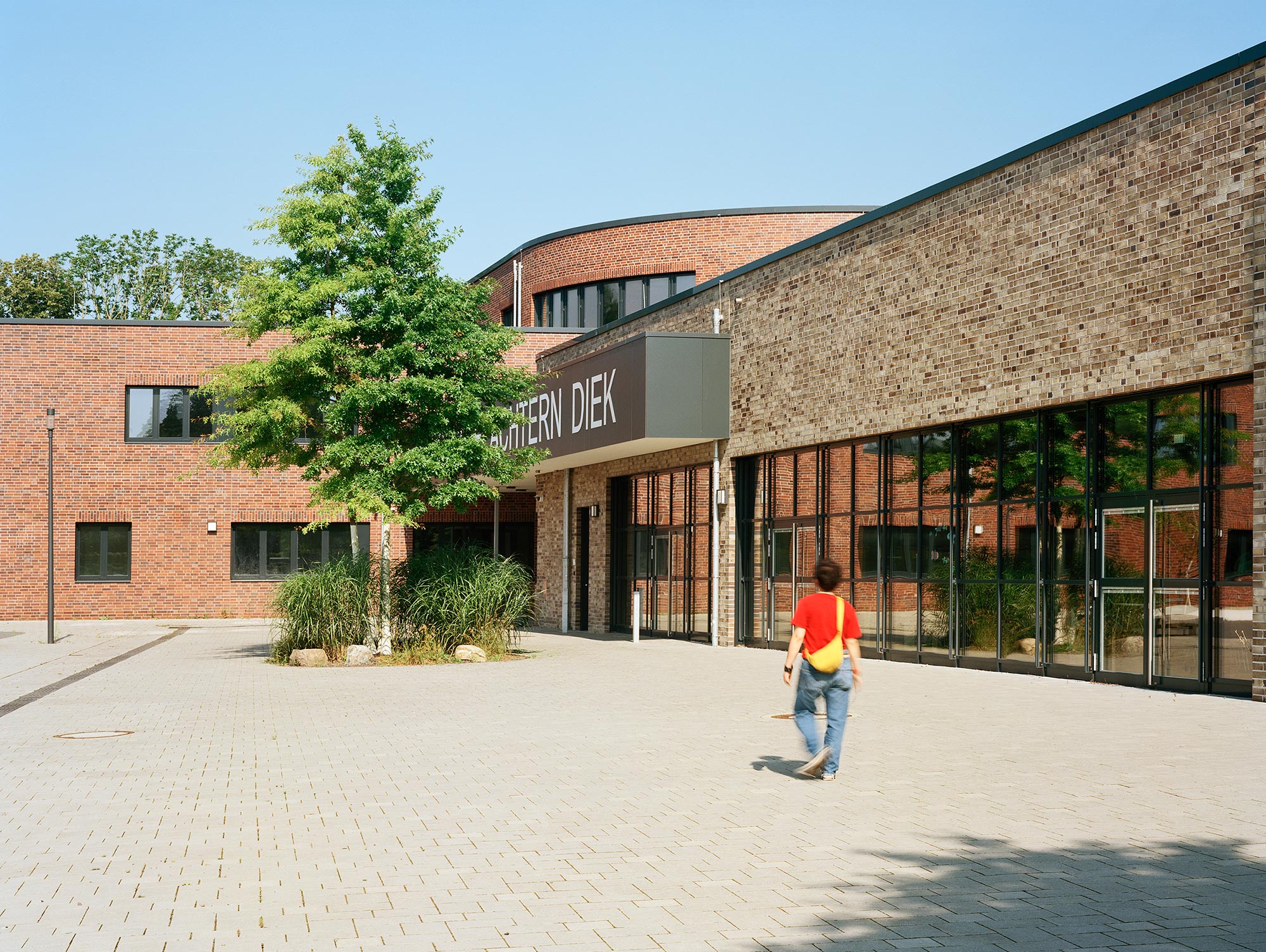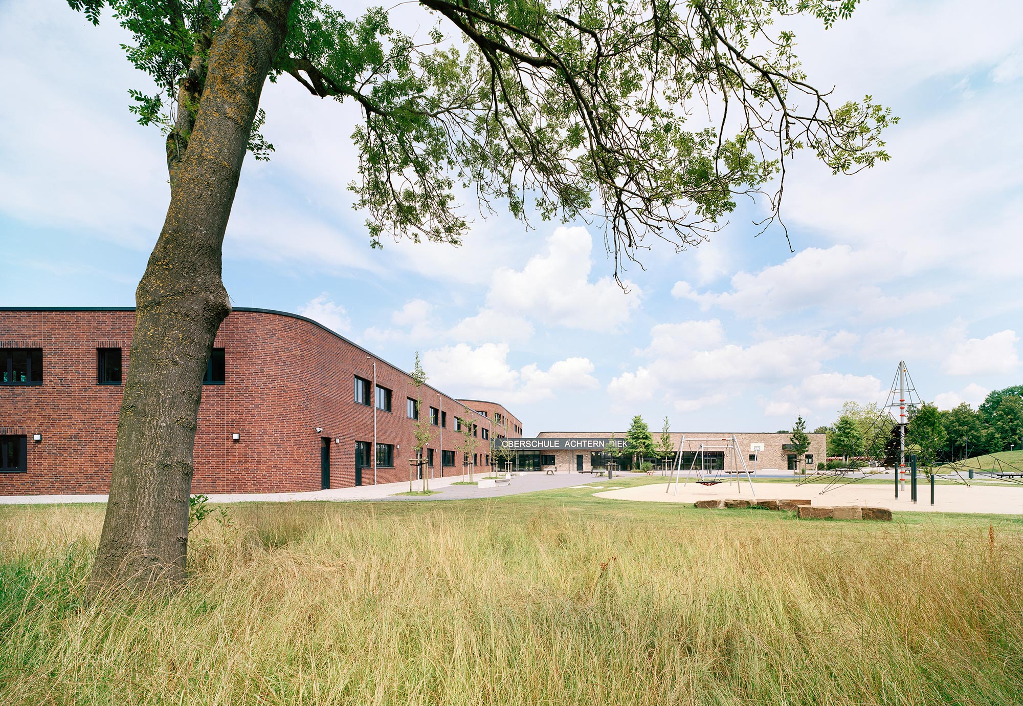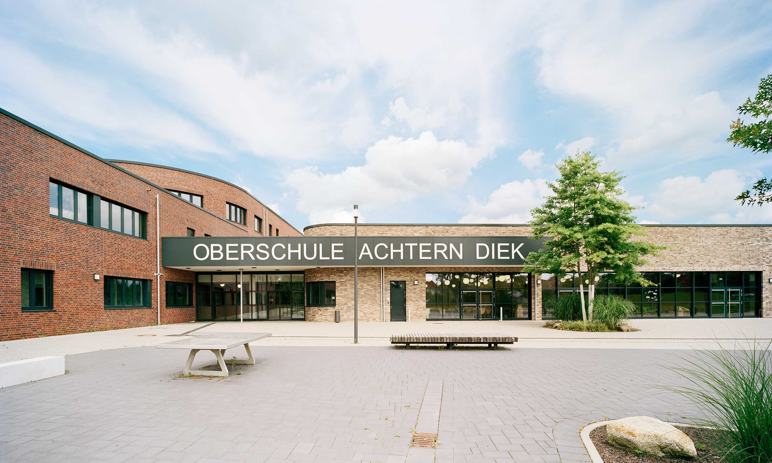 Die Oberschule Achtern Diek bezeichnet sich selbst als Lern- und Lebensort, an dem Kreativität und Freude einen hohen Stellenwert haben und die Schülerinnen und Schüler entsprechend ihrer Fähigkeiten gefordert werden. Das wird auch durch das architektonische Konzept unterstützt. Als Ganztagsschule ohne frühe Festlegung auf einen Schulzweig erstrecken sich die allgemeinen Unterrichtsbereiche über drei Geschosse. Diese sind als Cluster organisiert, sodass unterschiedliche Lernarten und die räumlichen Anforderungen an Inklusion und Binnendifferenzierung hier auch wirklich gelebt werden können, weil die Grenzen so fließend sind. Differenzierungsräume zwischen den Klassenzimmern bieten zusätzliche Bereiche, an denen kooperatives Lernen stattfindet und Treffpunkte entstehen. Die fachgebundenen Unterrichtsräume für beispielsweise Kunst, Textiles, Gestalten und Werken sind in einem separaten Gebäudeflügel angeordnet.