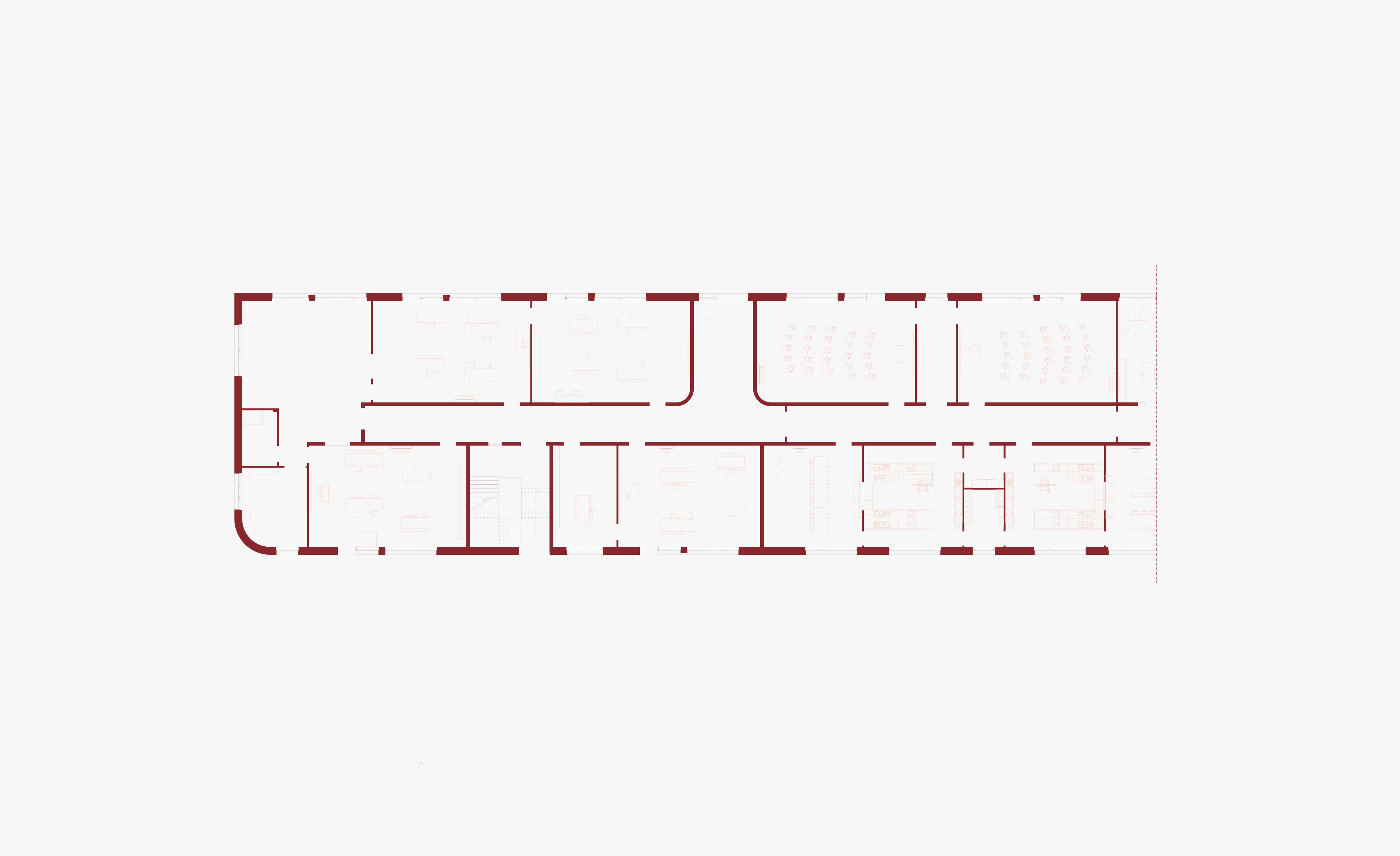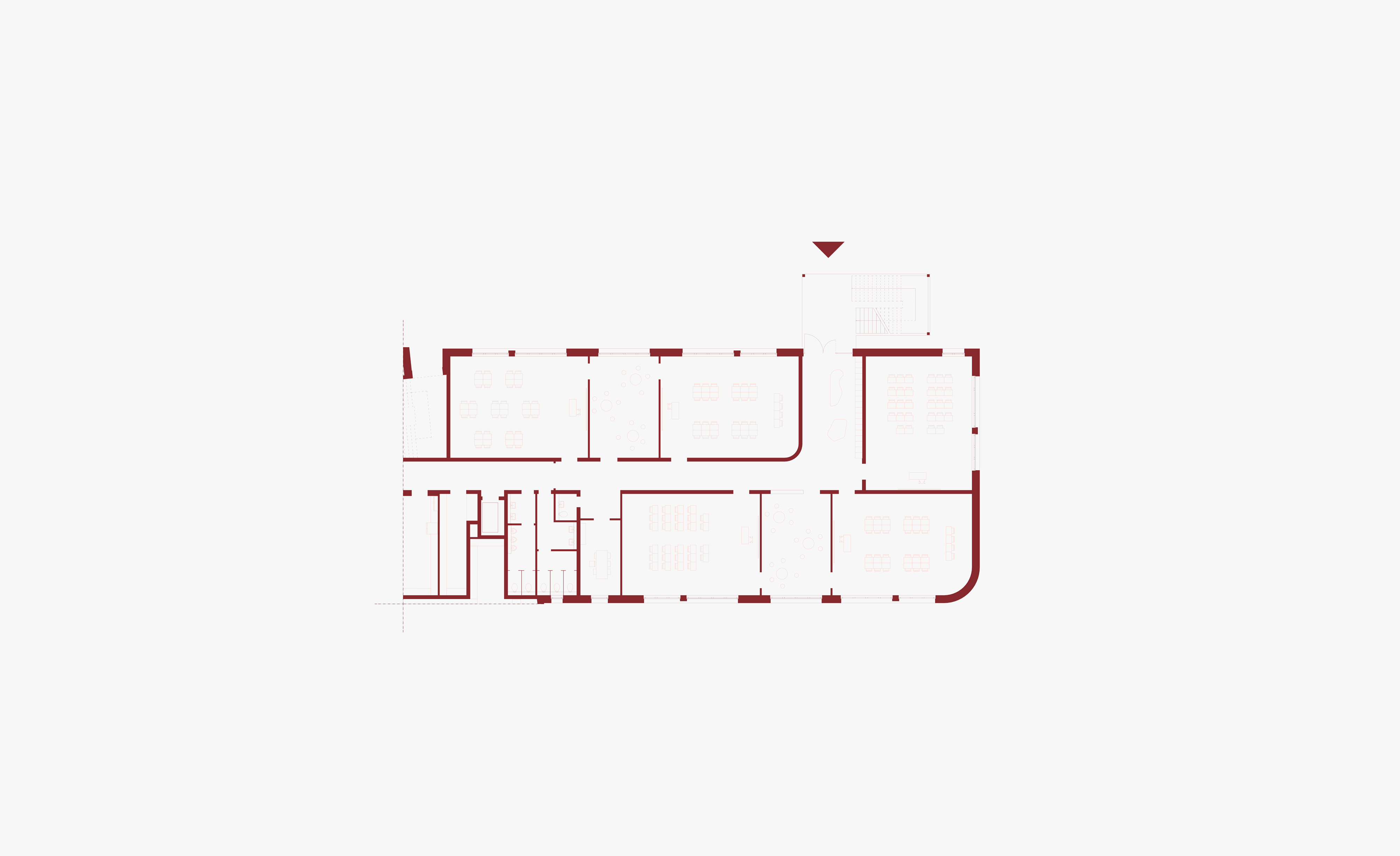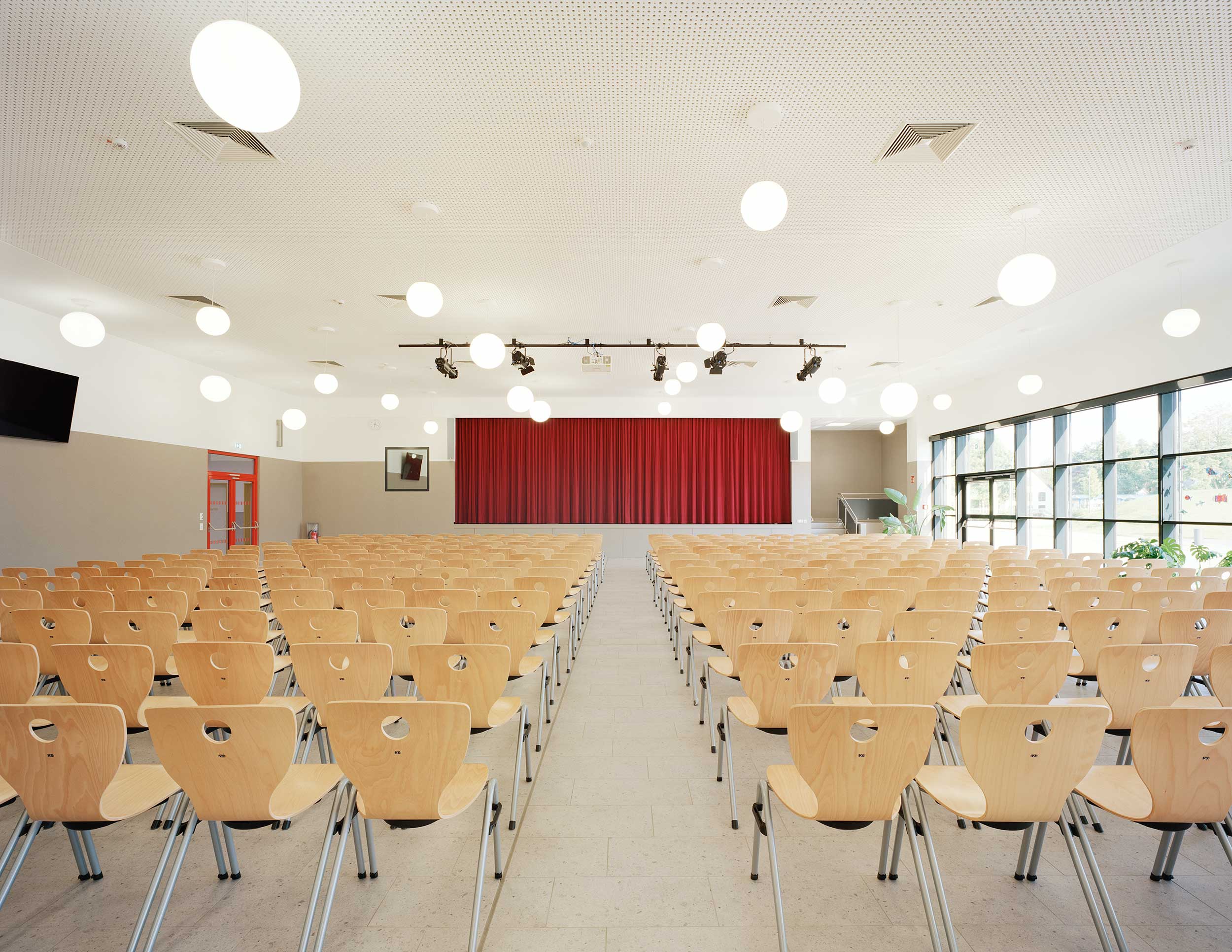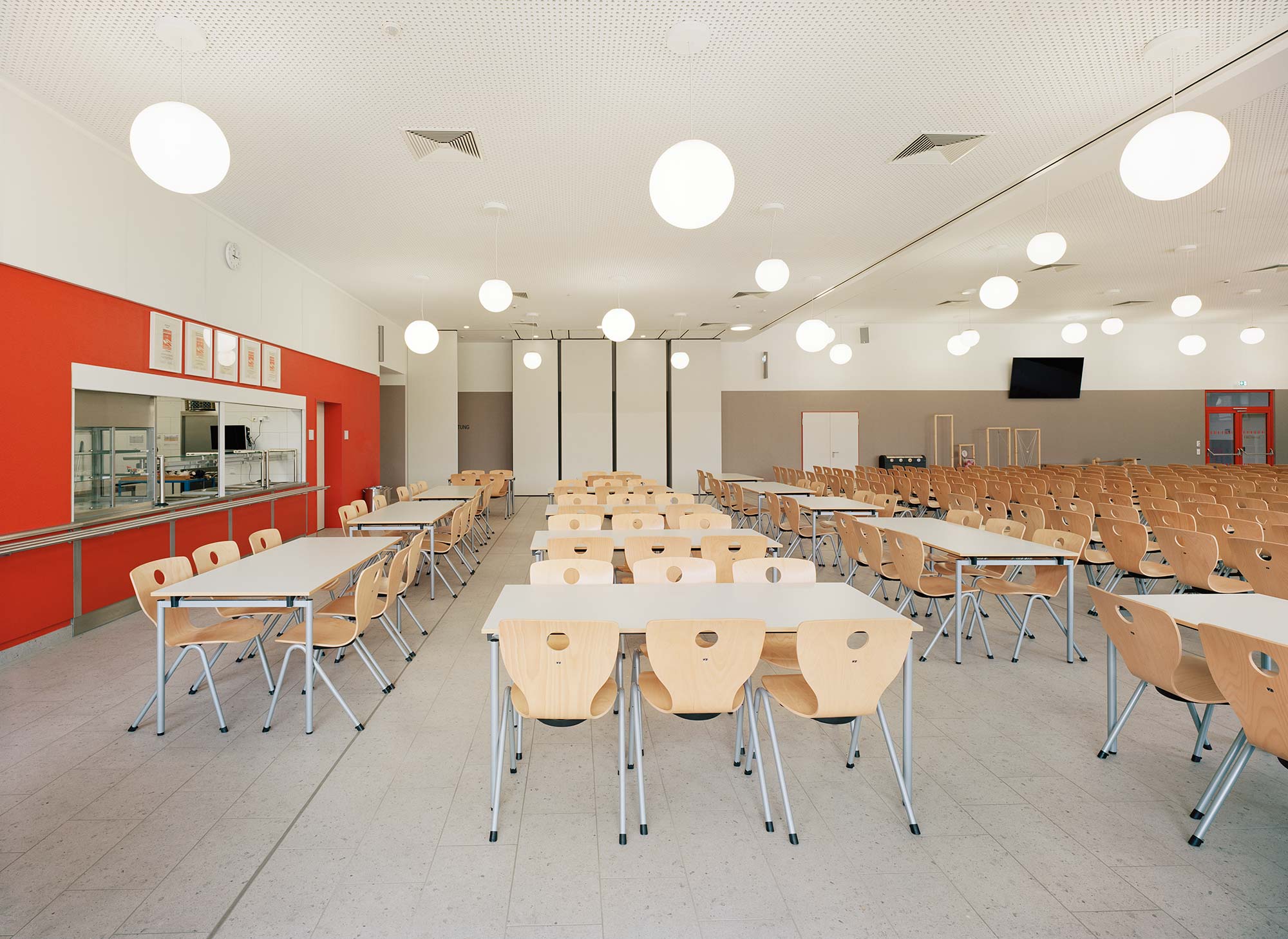 Der Ganztagsbereich wird architektonisch vom Verwaltungstrakt umarmt. Über das zweigeschossige Foyer wird dieser Bereich erschlossen, der neben der Mensa mit Lernküchen, Räume für Sozialarbeit und vor allem auch die Aula samt Pausenhalle und Bühne enthält. Durch mobile Trennwände kann die Bühne auch im normalen Schul- und Pausenbetrieb genutzt werden, sodass flexible Nutzungsszenarien entstehen. Die Lernküchen sind direkt an das Foyer und die Aula angeschlossen, sodass bei schulinternen Veranstaltungen und Festen die Schülerinnen und Schüler selbst zu Kellner:innen werden und auf kurzem Weg das Catering anbieten können.