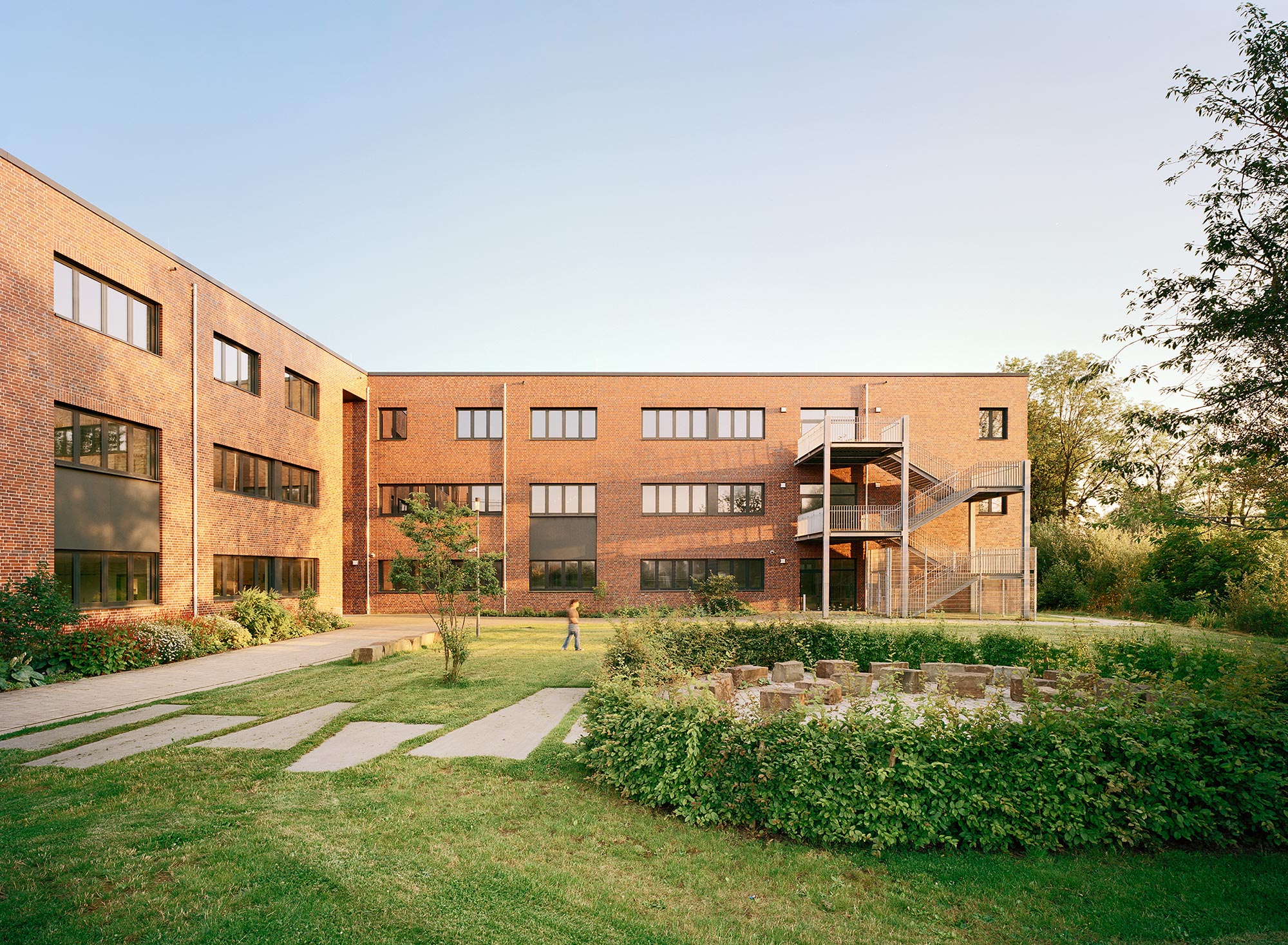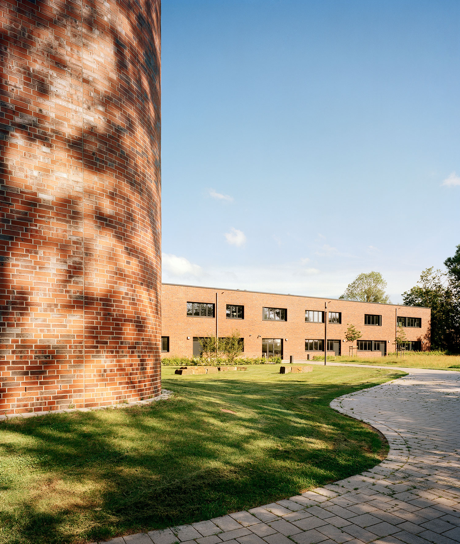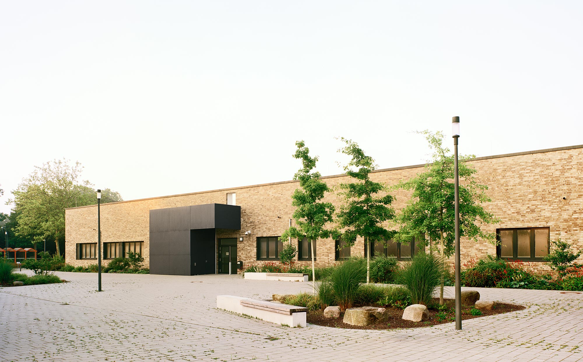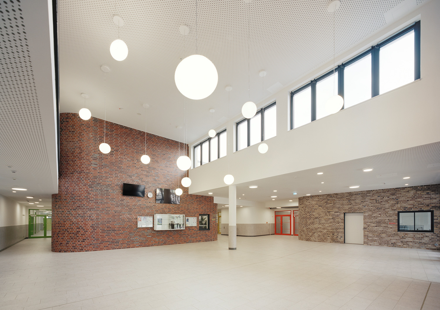 Das vorherrschende Material der Umgebung ist Klinker. So fiel auch die Wahl der Schulfassade auf das für Norddeutschland typische Fassadenmaterial. Durch die unterschiedlichen Abstufungen aus Rot-, Orange- und Brauntönen wirkt die Fassade lebendig und grenzt die einzelnen Nutzungsbereiche voneinander ab. Und das Material zieht sich durch bis ins Foyer: Als Ort der Begegnung wurden die Backsteinfassaden durch die abgerundeten Ecken der Baukörper von außen nach innen verlängert und treffen hier auf die weiß verputzen Wände und die Sichtbetonsockel des Foyers.