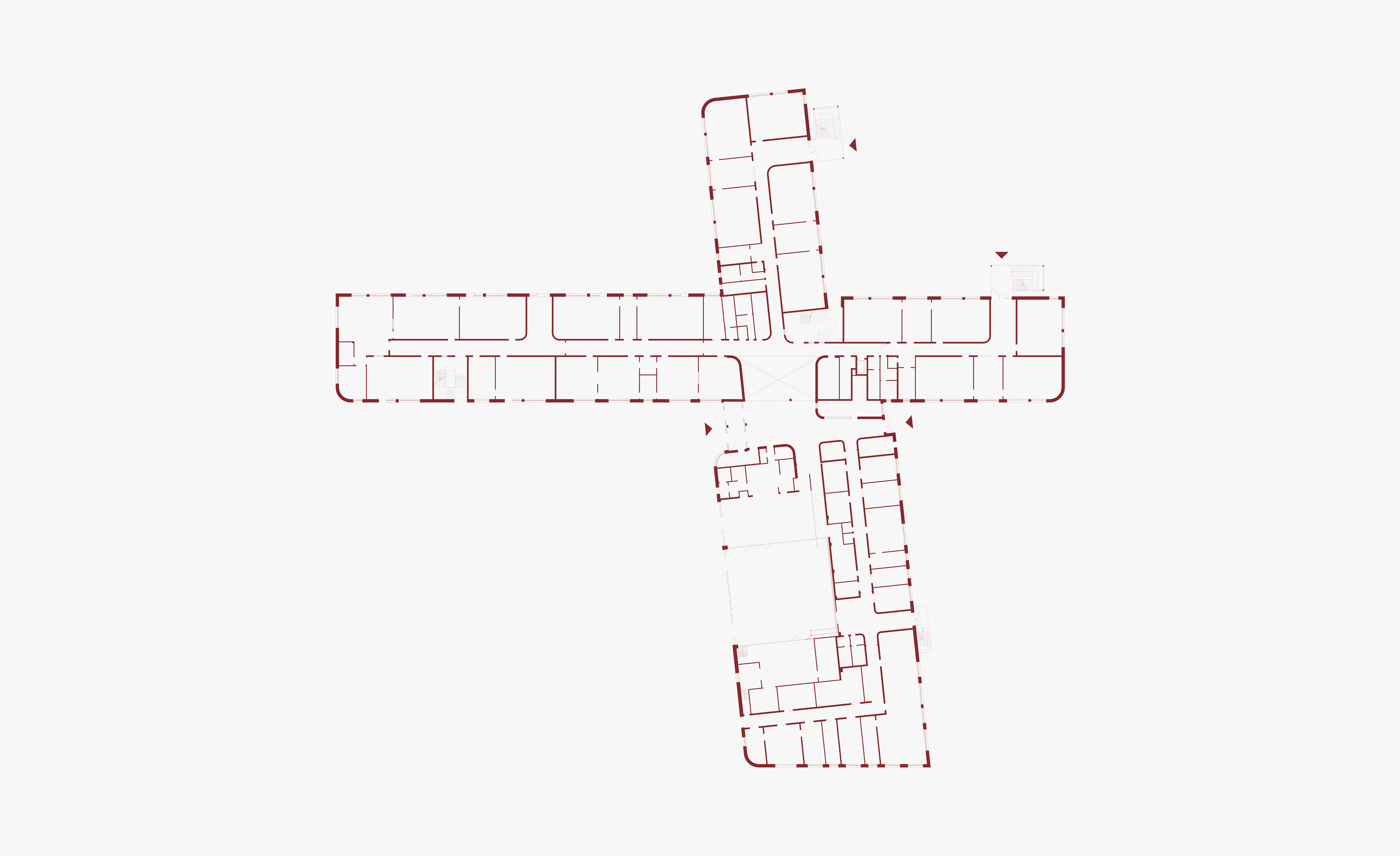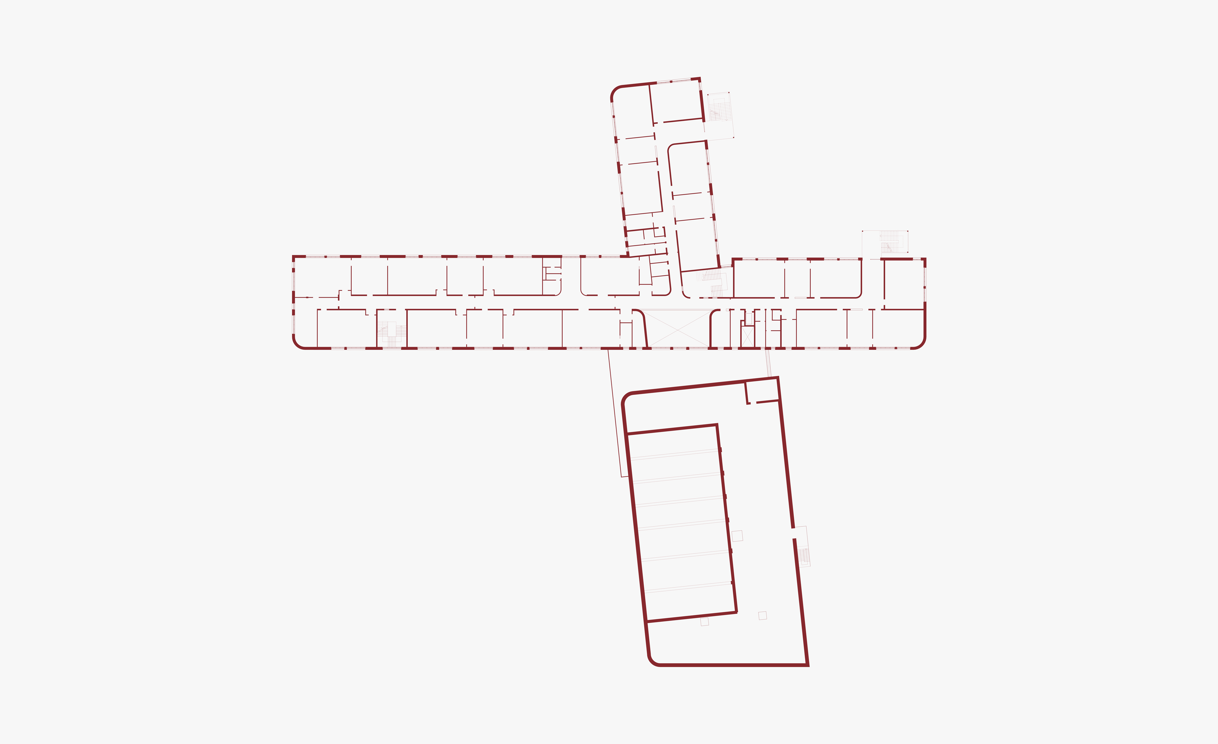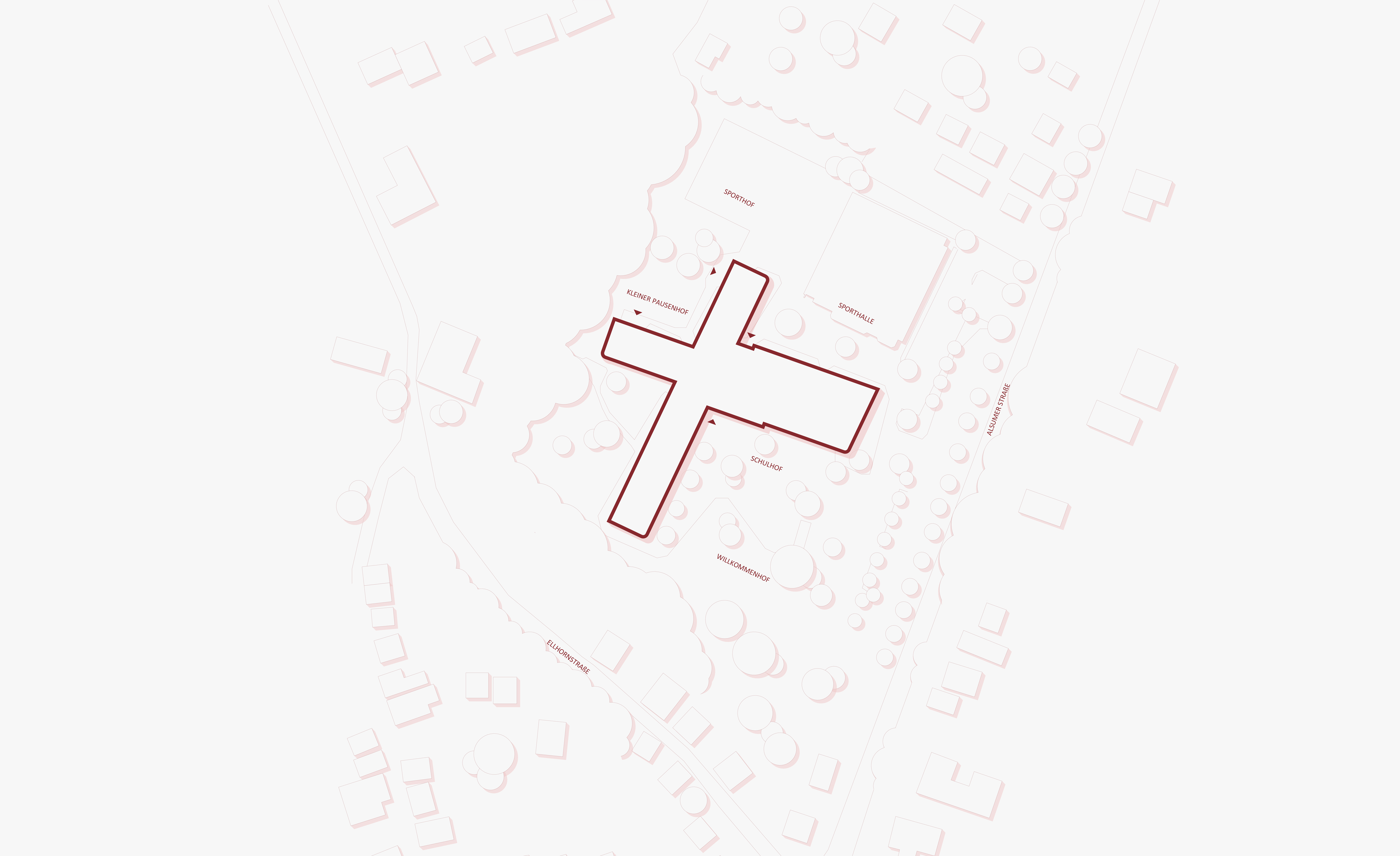 Mit zwei sich überschneidenden, L-förmigen Baukörpern orientiert sich der Neubau stark an der Kubatur des Baufelds. Durch die scherenartige Öffnung zu allen vier Seiten entstehen vier Höfe, die unterschiedliche Aufenthaltsqualitäten und Nutzungsmöglichkeiten bieten. Aufgeteilt in Ganztagsbereich, Fachraum-, Klassen- und Verwaltungstrakt sind die Funktionen schon von außen in Höhe und Farbgebung klar ablesbar. Was sie eint, ist ein gemeinsames, zweigeschossiges Foyer, das gleichzeitig Zentrum und Herz der Schule ist und alle Bereiche miteinander verbindet. Im Kreuzungspunkt der Baukörper befindet sich die Bibliothek, die als Lichtturm im dritten Obergeschoss über den Dächern der restlichen Funktionen thront.